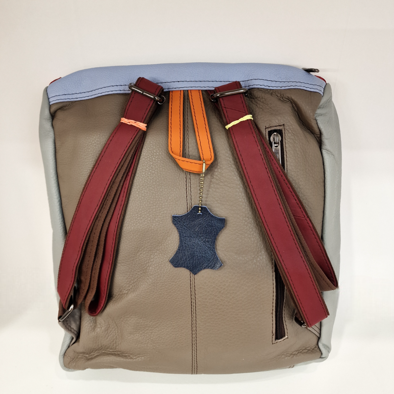 Mochila 100% couro reciclado, alça de mão e dupla alça de ombro ajustável e extensível.