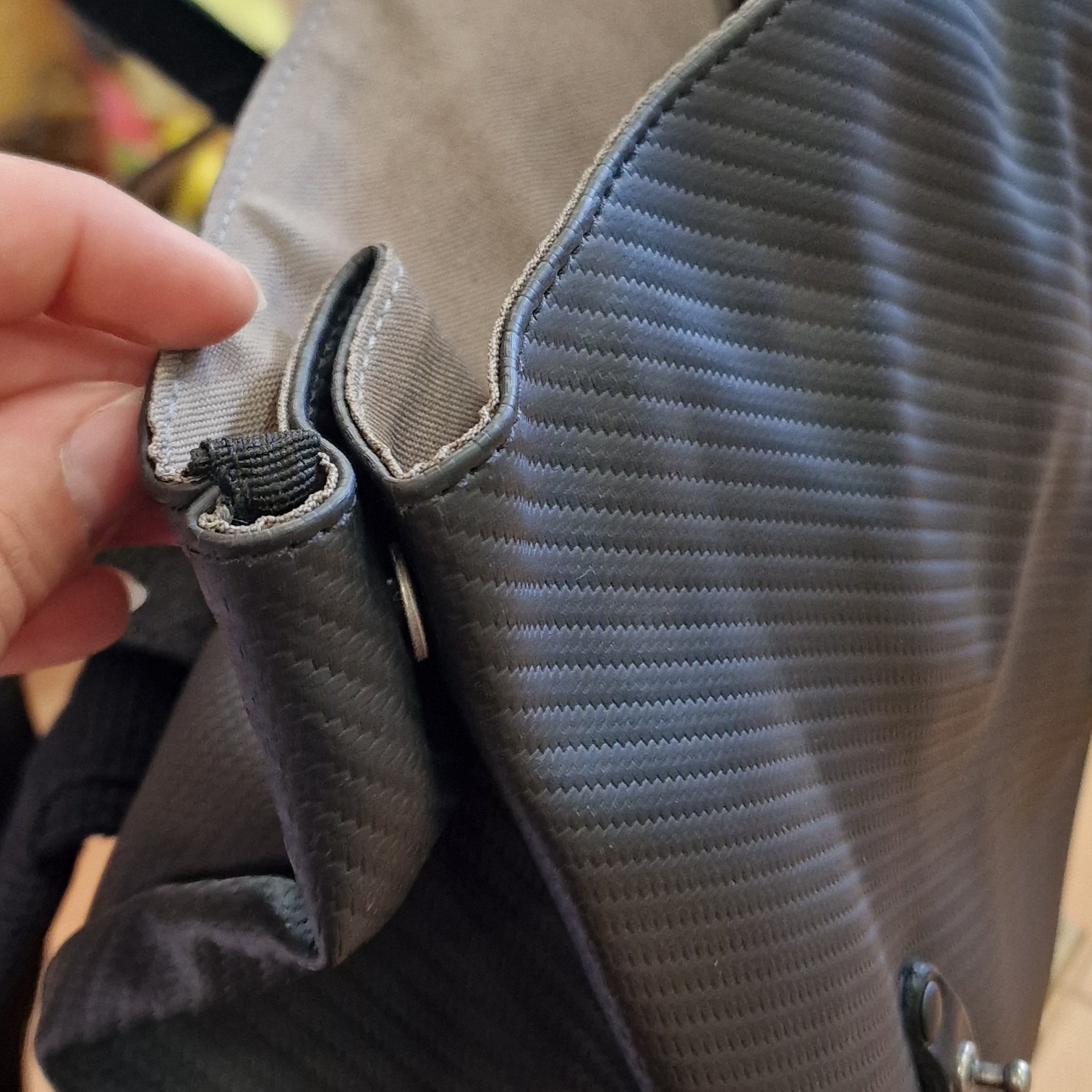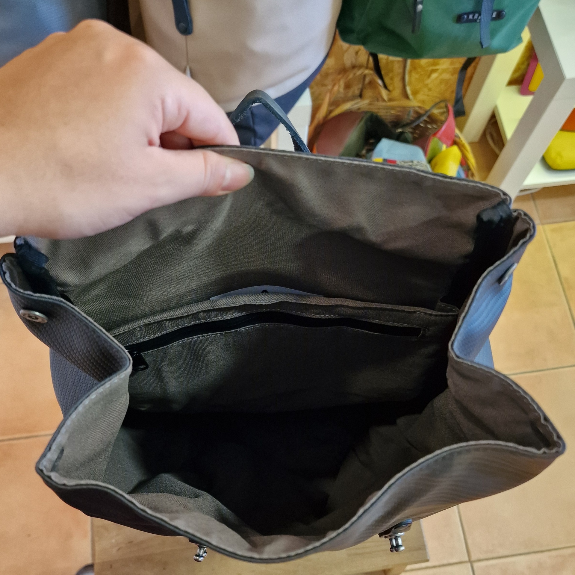 • Interior de mala ou mochila em tecido castanho claro com bolso interno de fecho preto