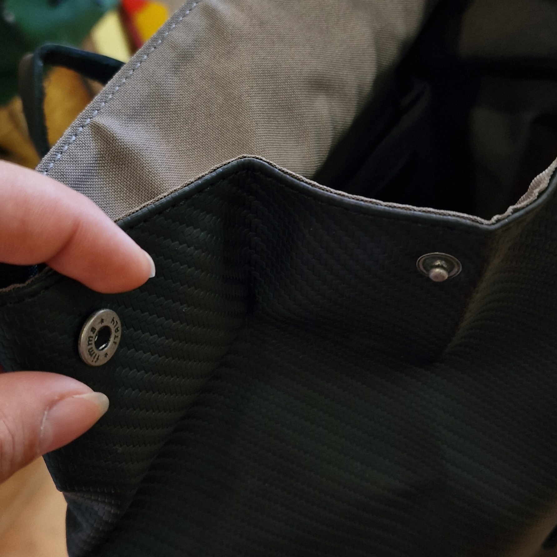• Bolsa cinzenta com interior preto e botão de pressão metálico