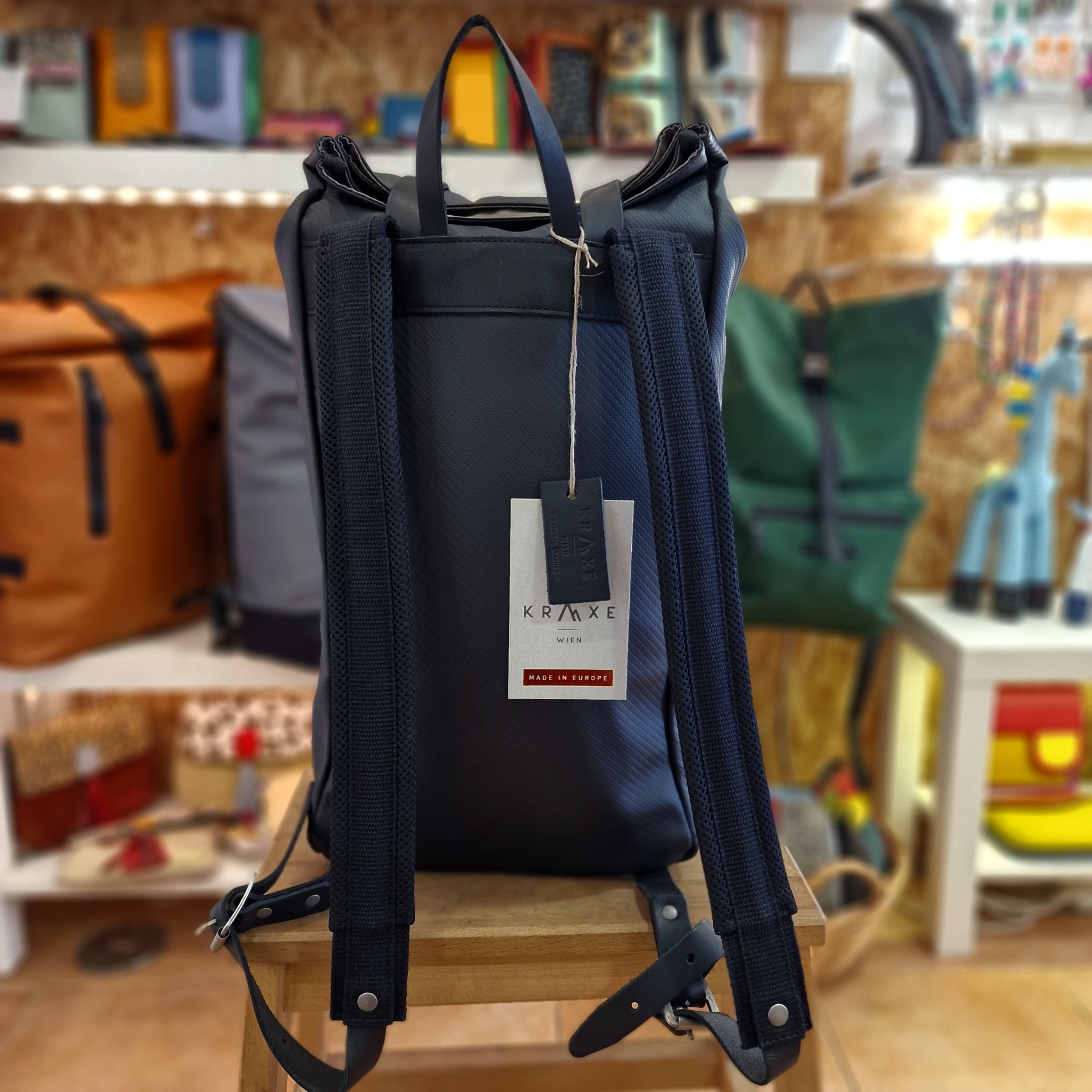 • Mochila preta com etiqueta K&MAKE pendurada em loja