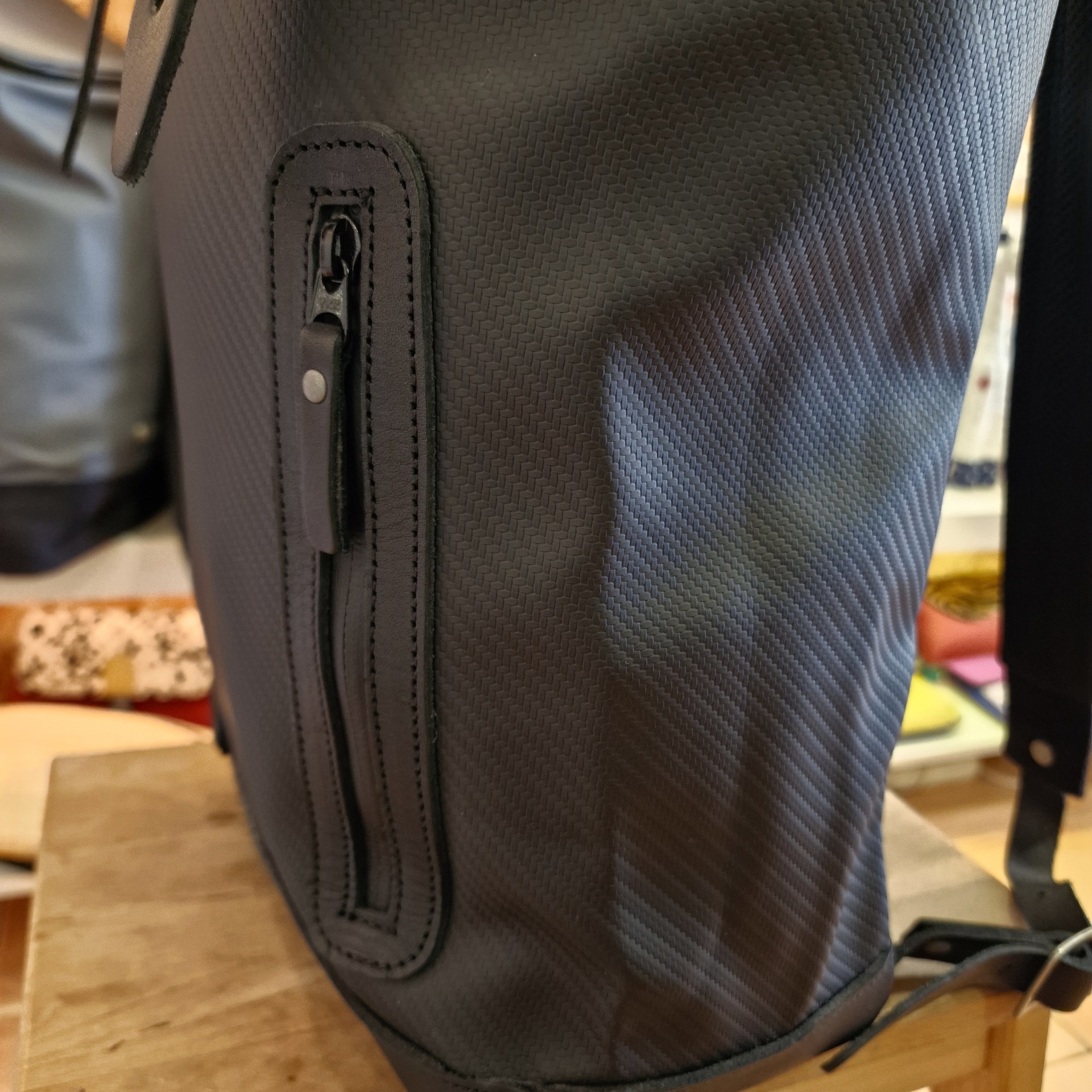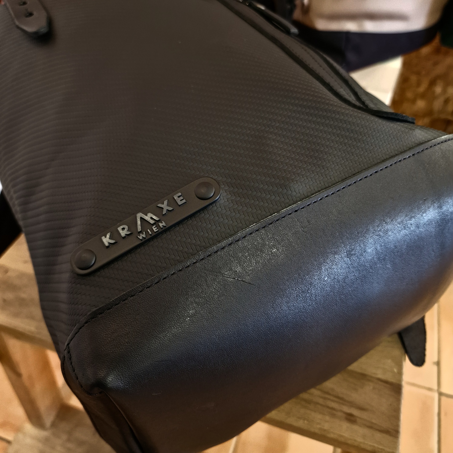• Mala preta KRAKE MILANO com base em couro sobre banco de madeira