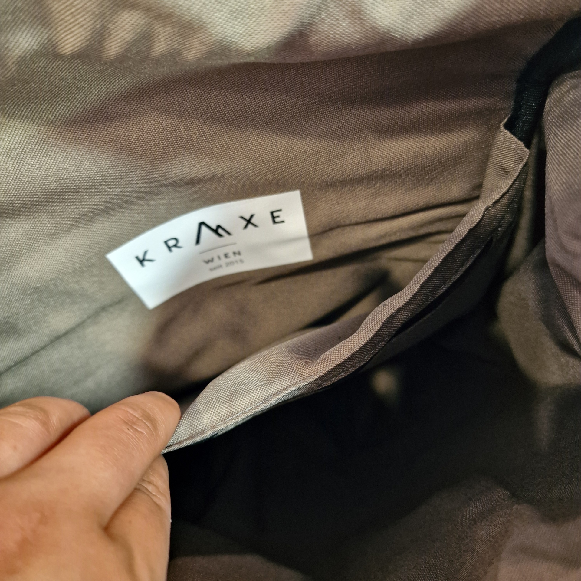 • Etiqueta interna branca com texto KRMA XE numa bolsa castanha.