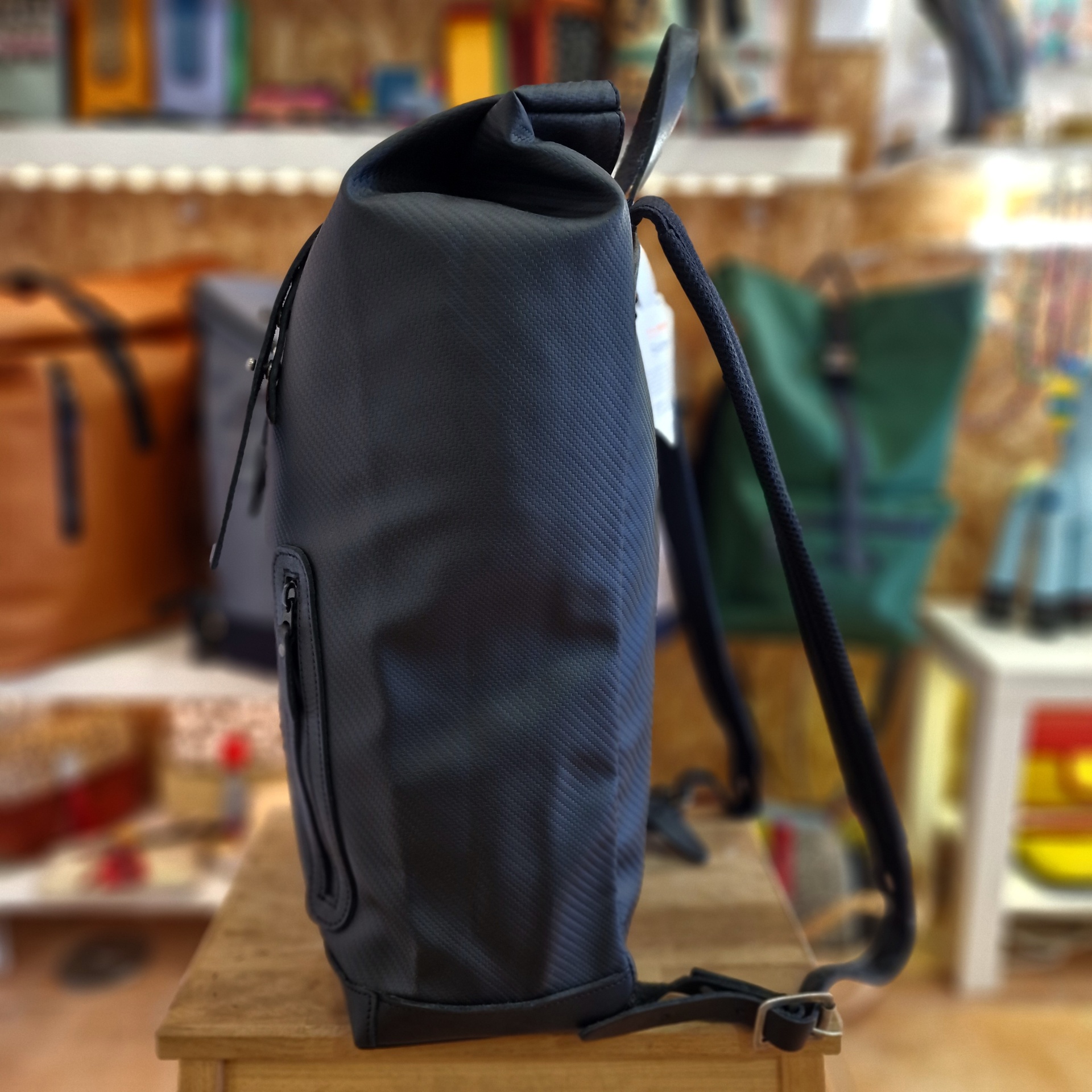 • Mochila preta de perfil com alças ajustáveis sobre madeira