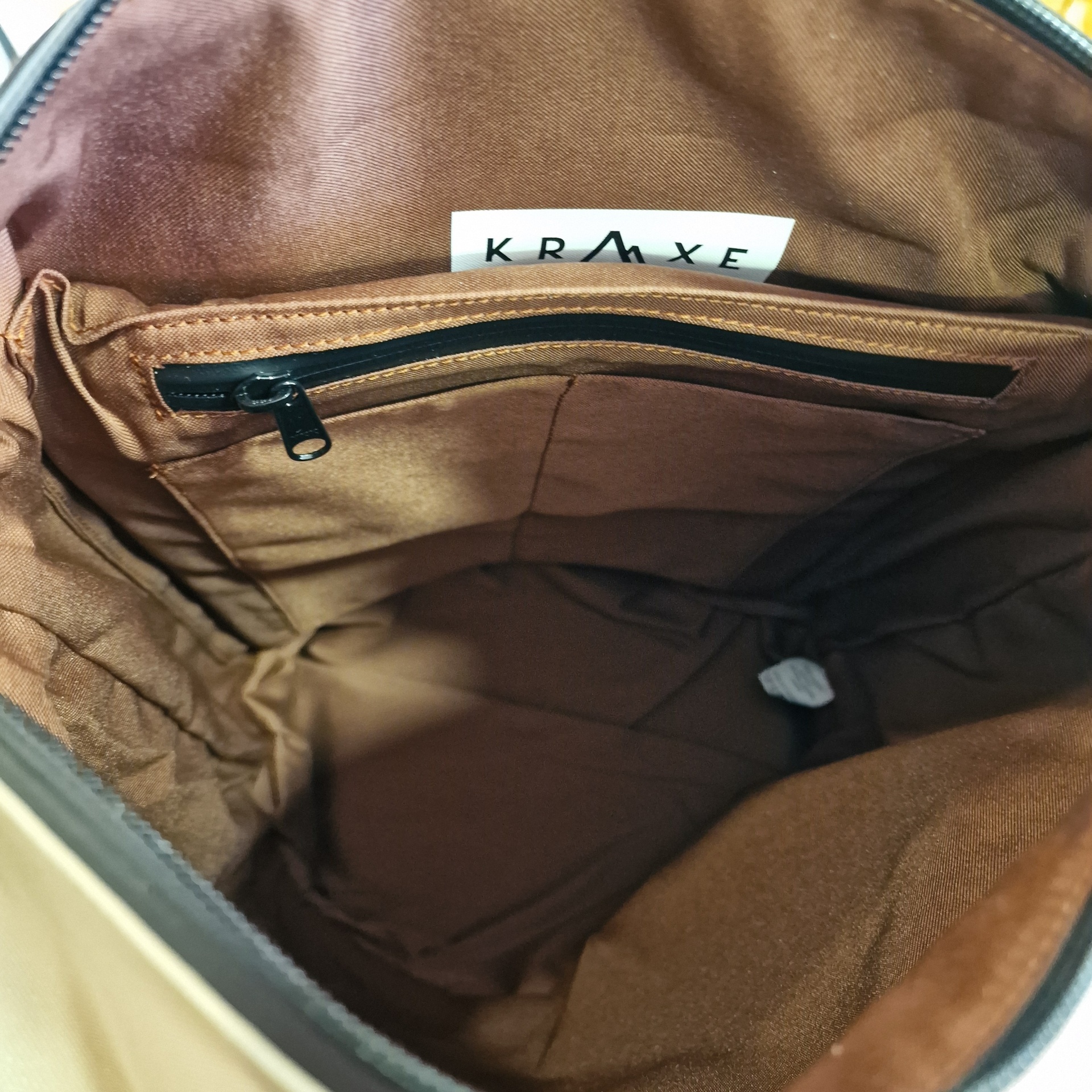 • Interior de mochila castanha com fecho e etiqueta KRAVXE