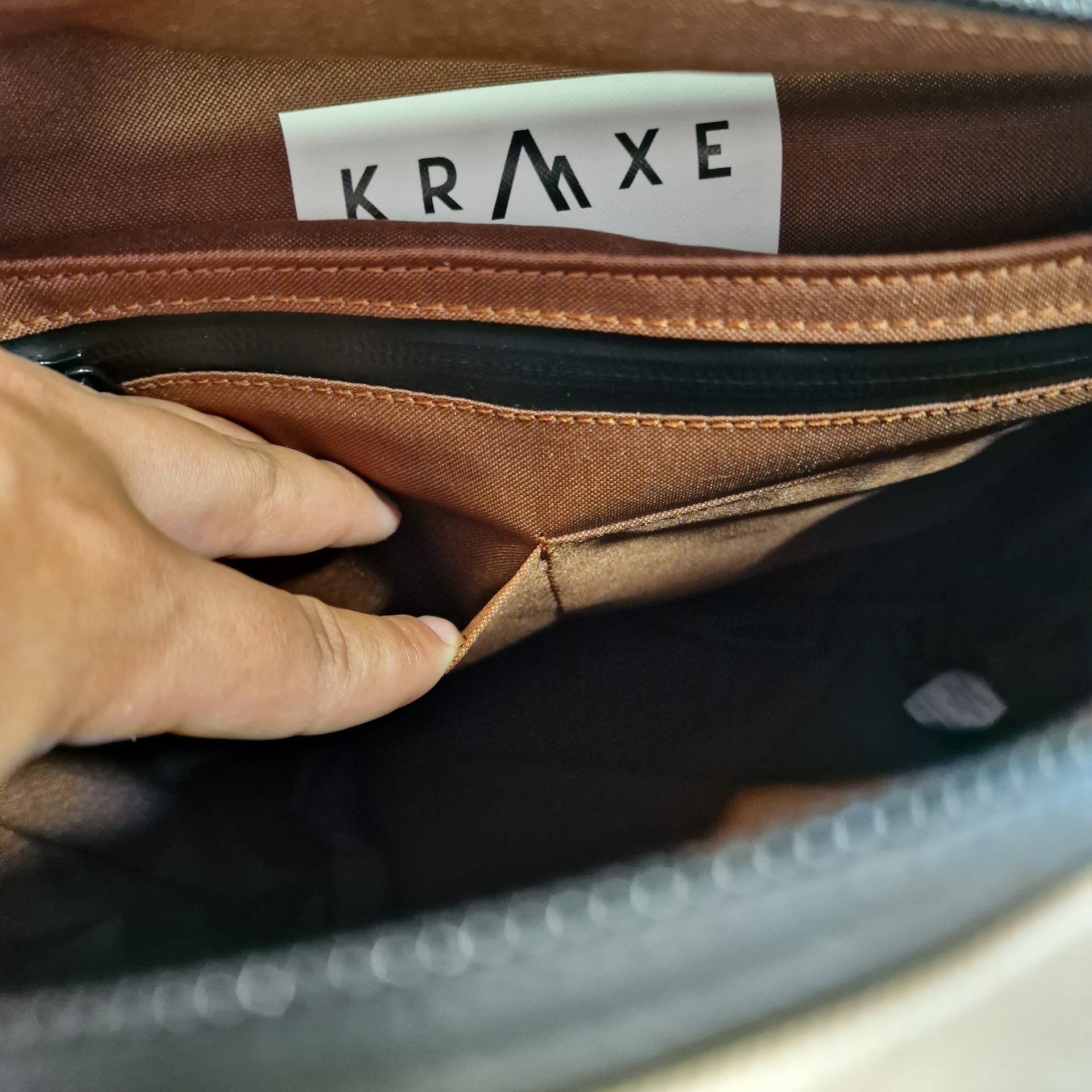 • Interior de bolsa com etiqueta KRMXE e compartimentos castanhos