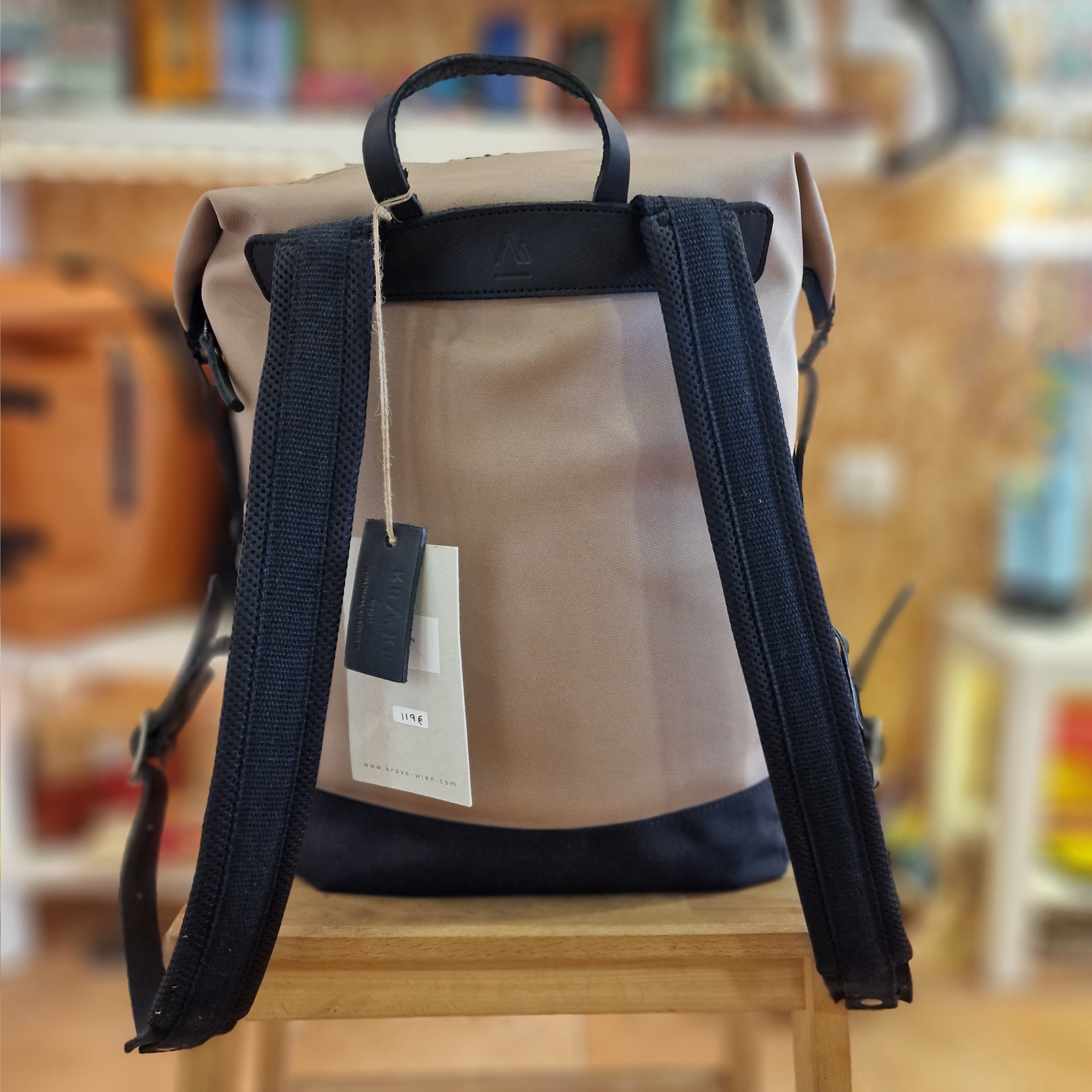 • Mochila bege e preta com bolso frontal e etiqueta KRAKE
