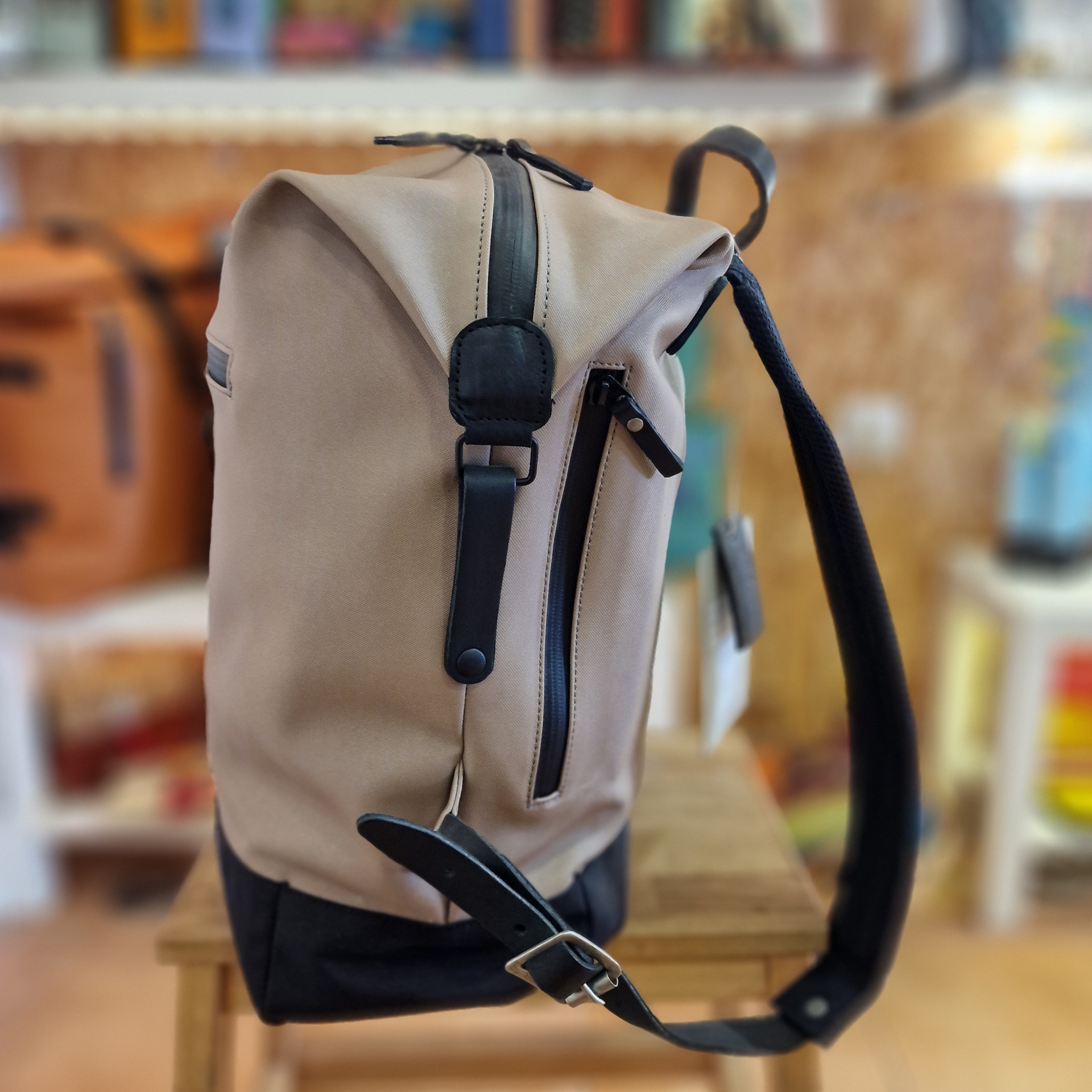 • Mochila bege e preta com bolsa frontal e alças pretas em ambiente interior