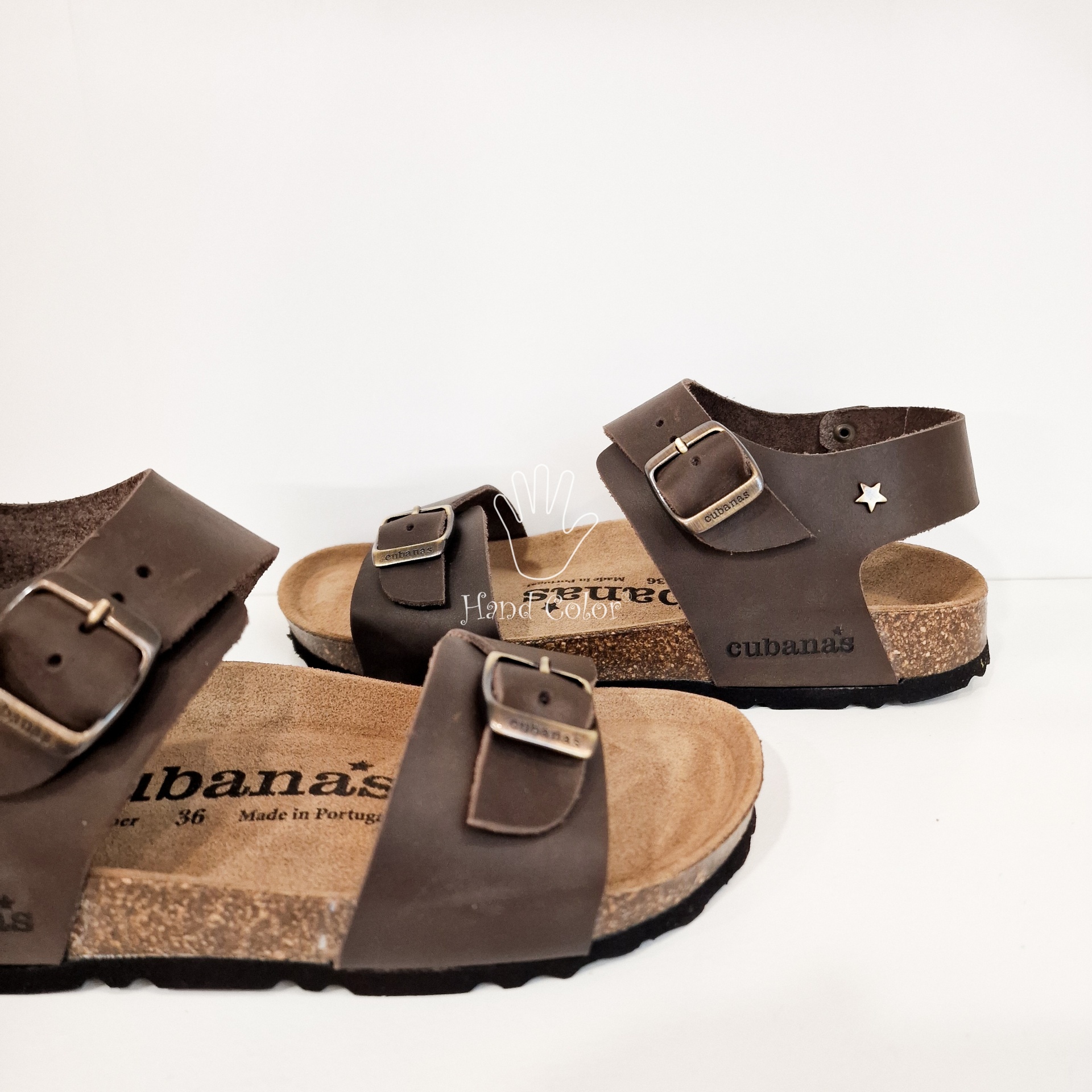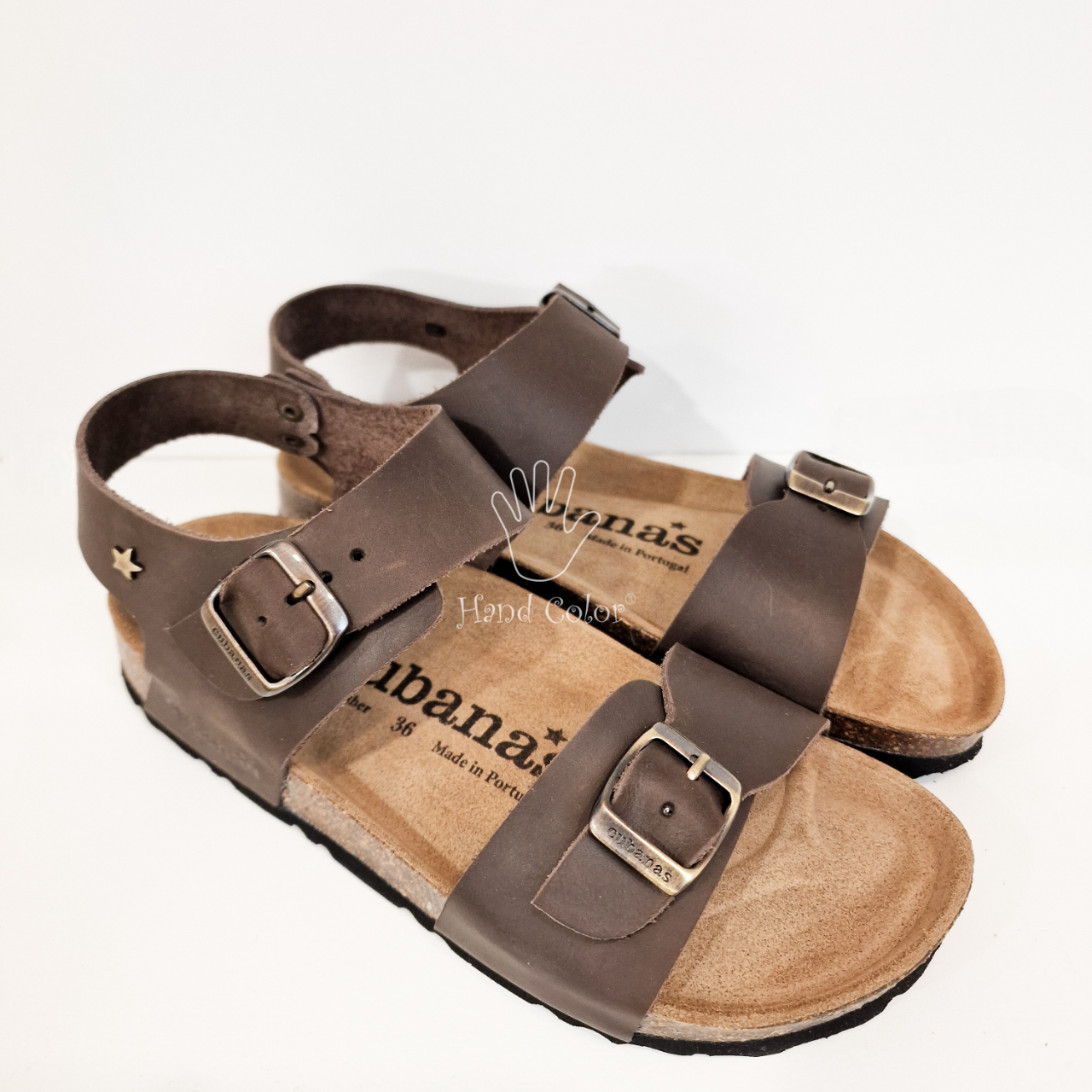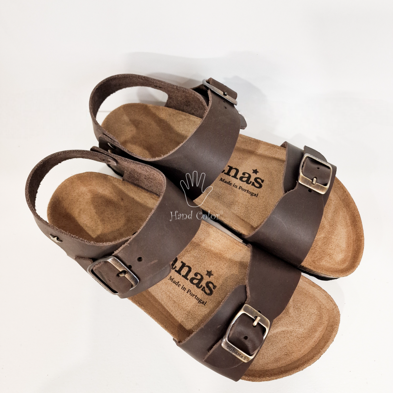 • Sandálias castanho escuro de couro com fivelas, palmilha com texto Hana's Made in Portugal