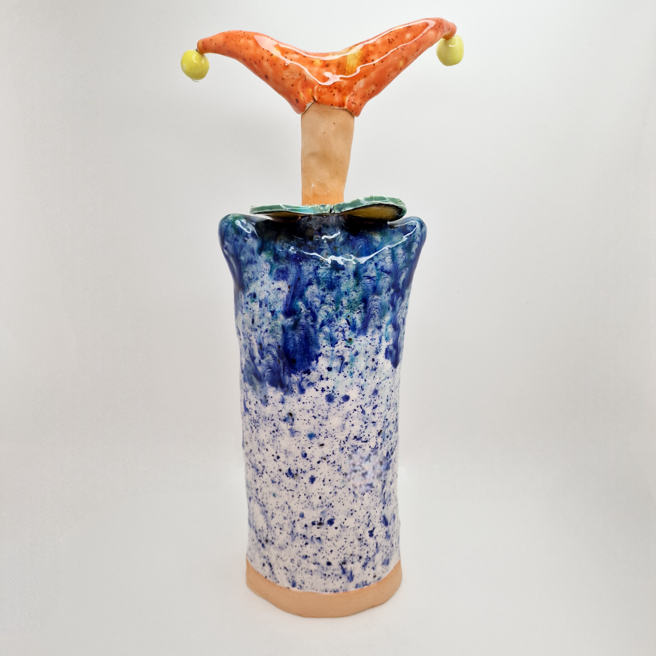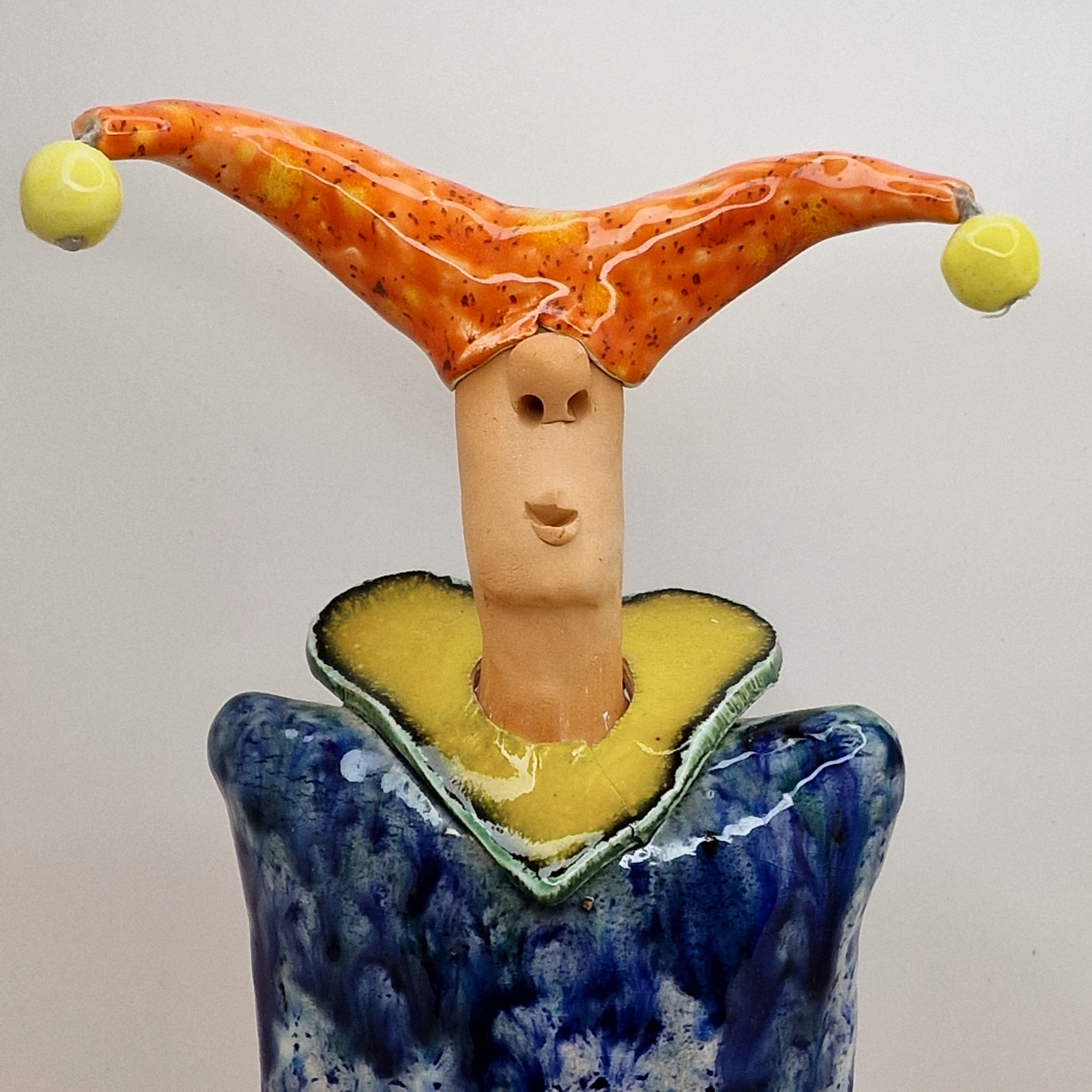 • Escultura colorida em cerâmica com chapéu laranja, bolas amarelas e roupa azul