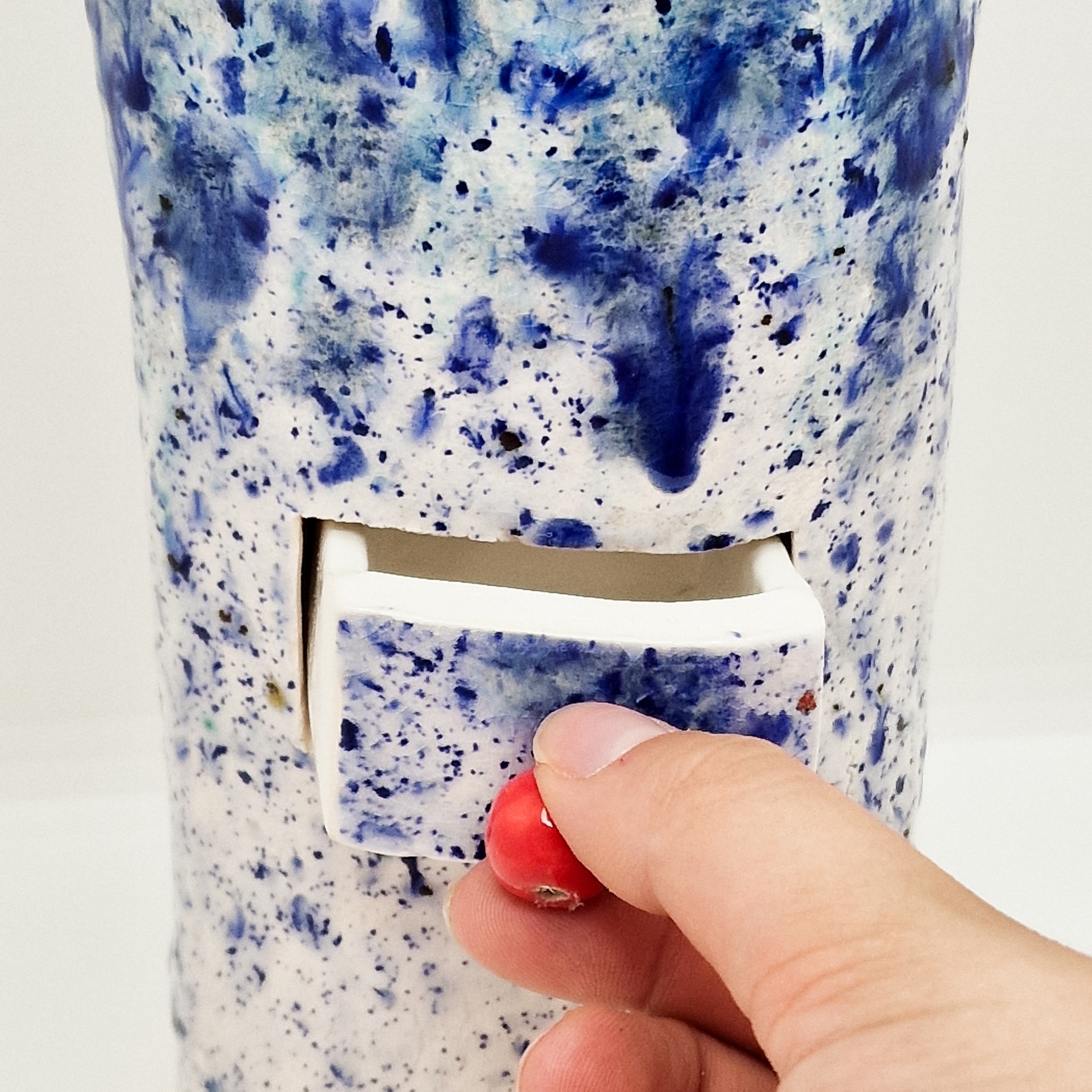 • Objeto de cerâmica branca com manchas azuis e mecanismo retangular com botão vermelho sendo pressionado por uma mão.