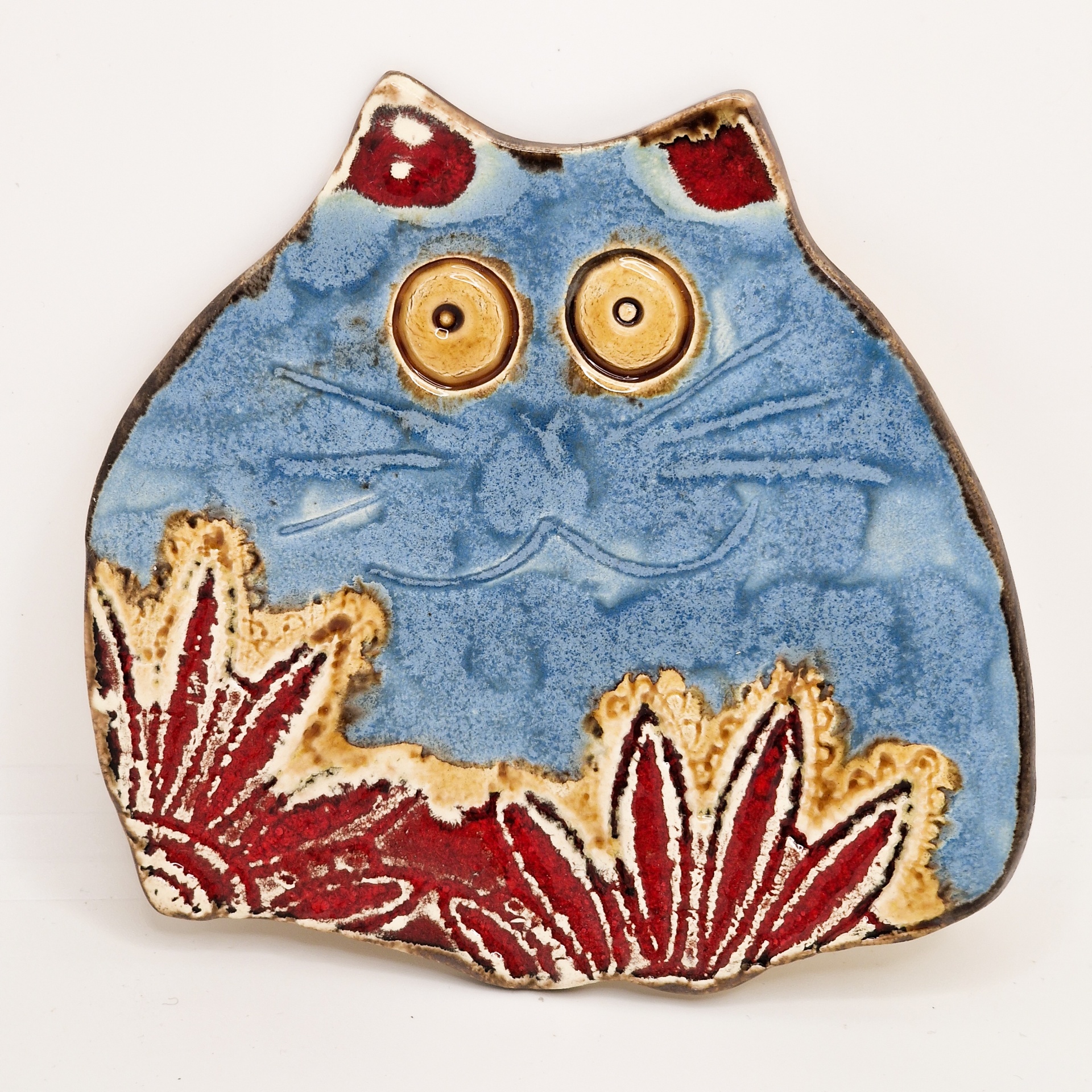 • Figura decorativa de cerâmica em forma de gato azul com detalhes vermelhos e amarelos