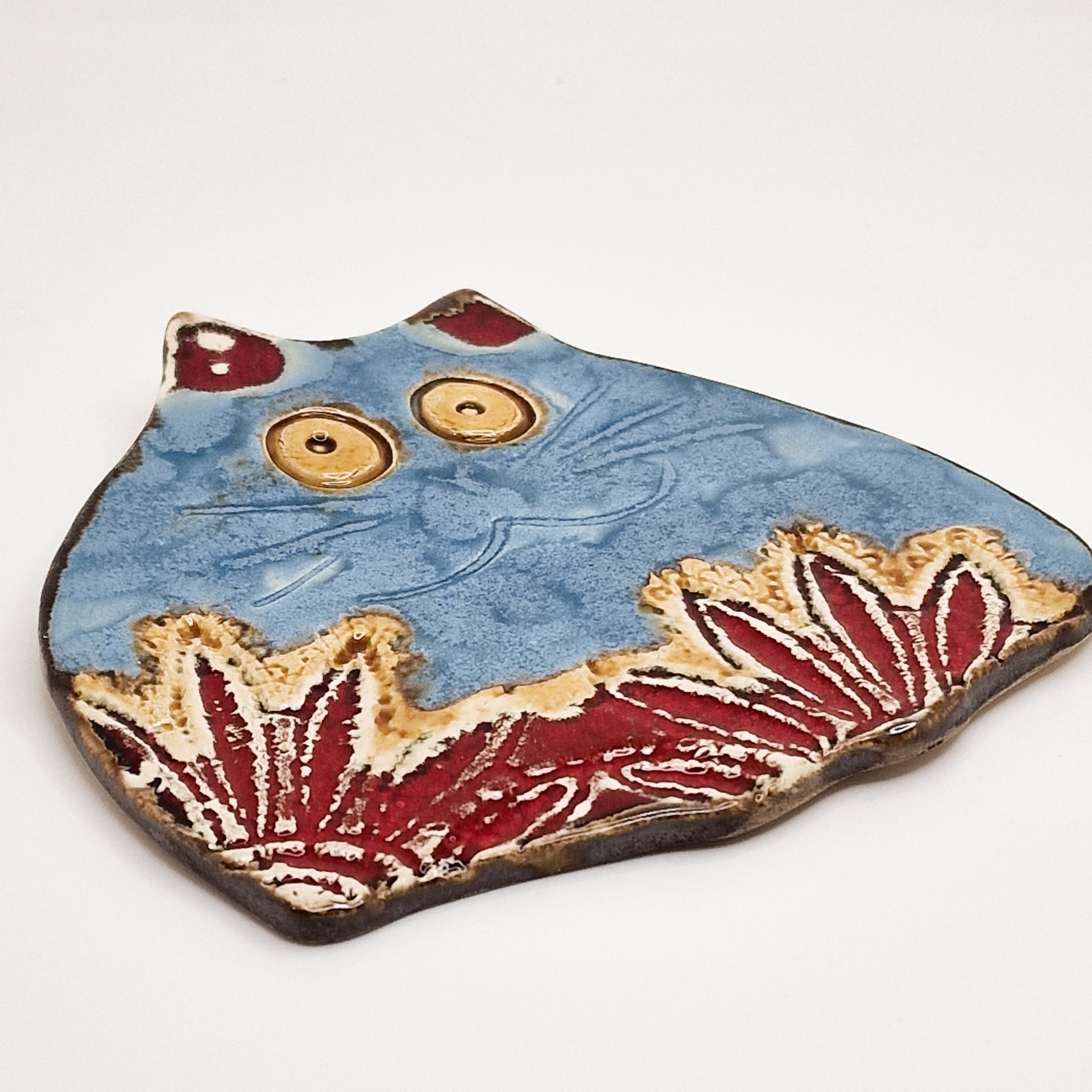 Figura decorativa de cerâmica em forma de gato azul com detalhes vermelhos e amarelos