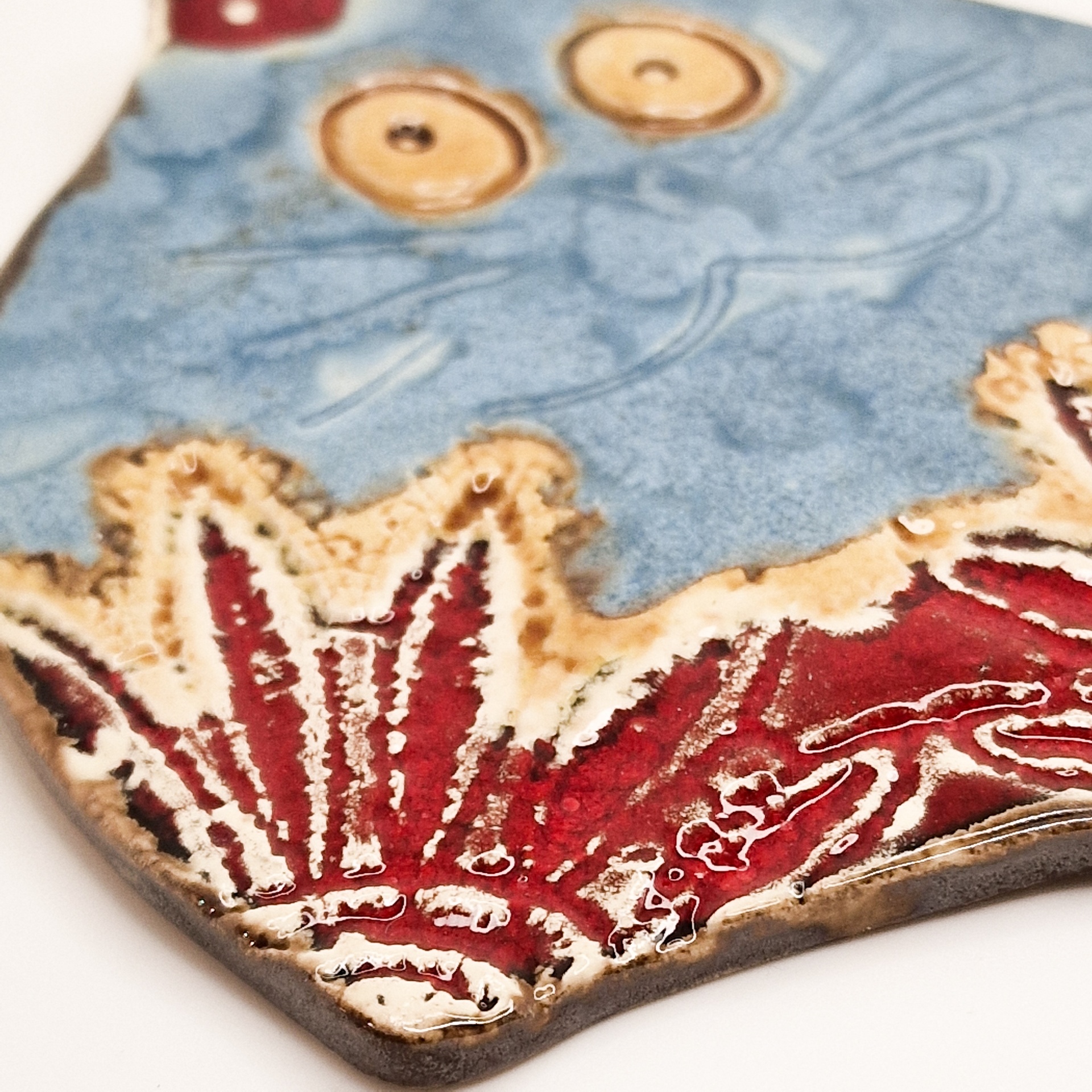 • Peça decorativa de cerâmica azul com padrões vermelhos em relevo e dois buracos circulares