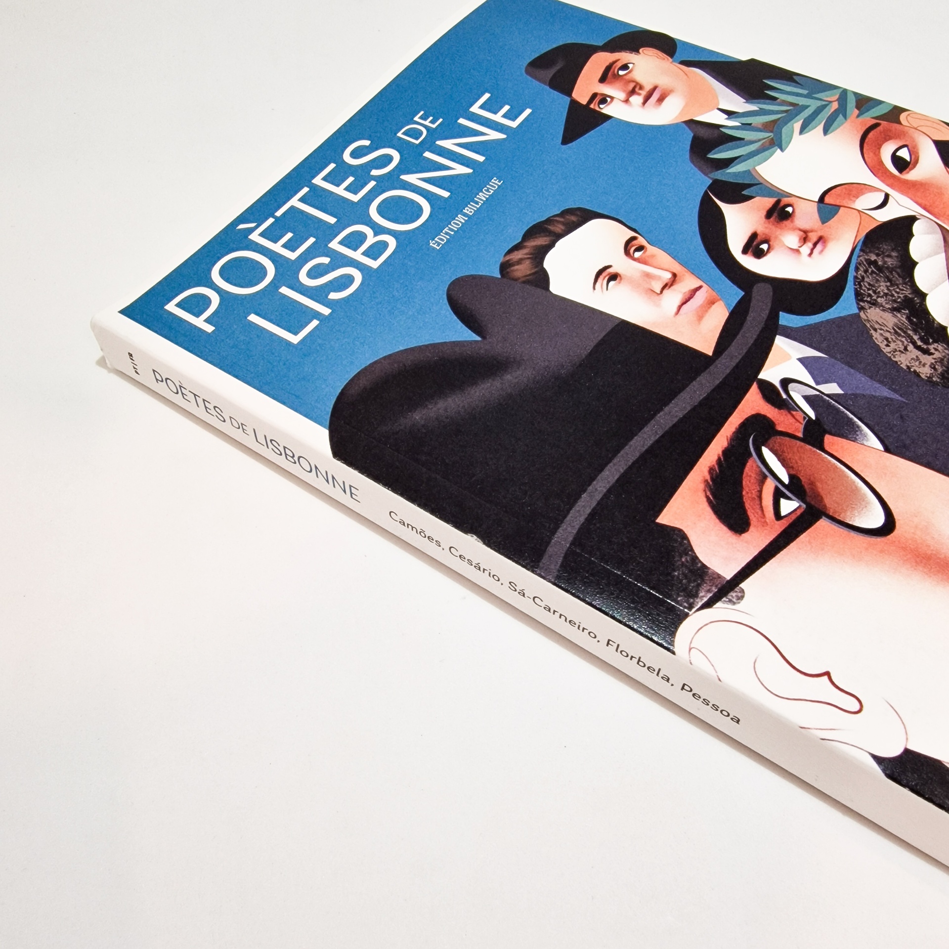 • Livro POÈTES DE LISBONNE com capa azul e ilustrações de rostos e plantas