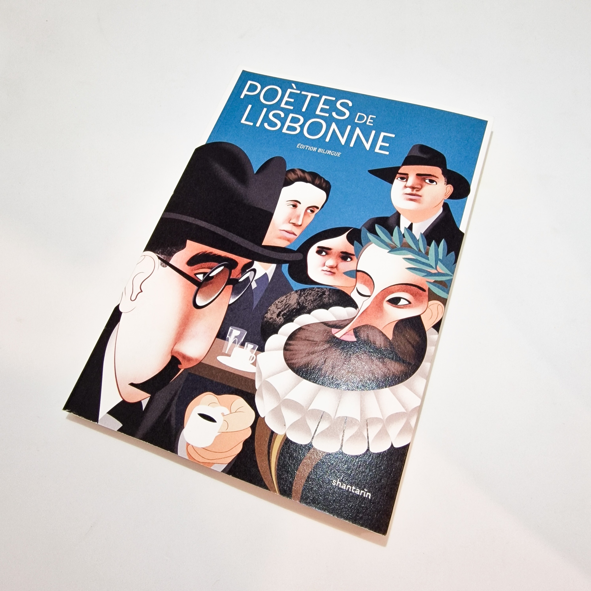 • Capa de um livro ilustrado intitulado POÈTES DE LISBONNE com caricaturas coloridas