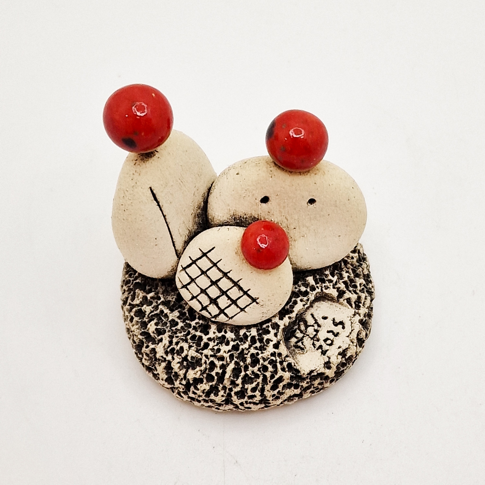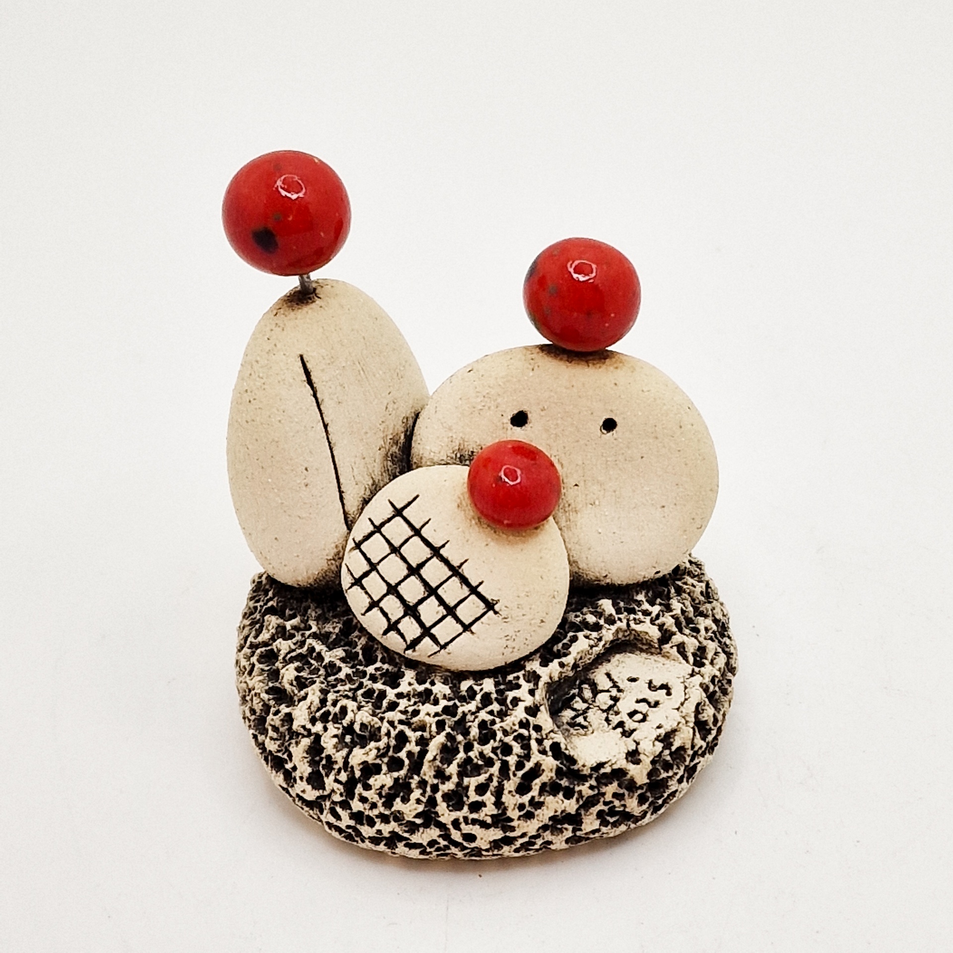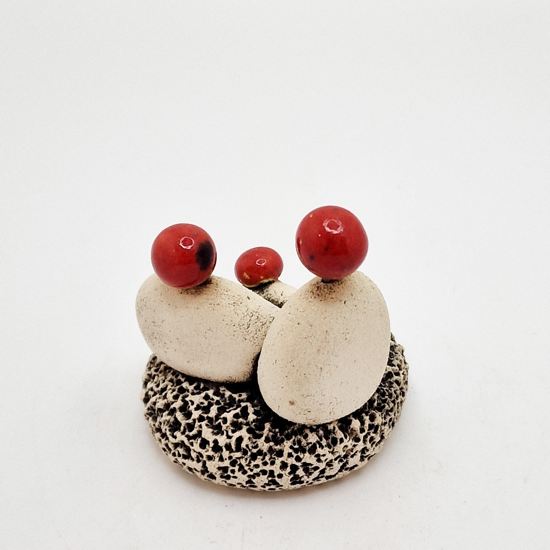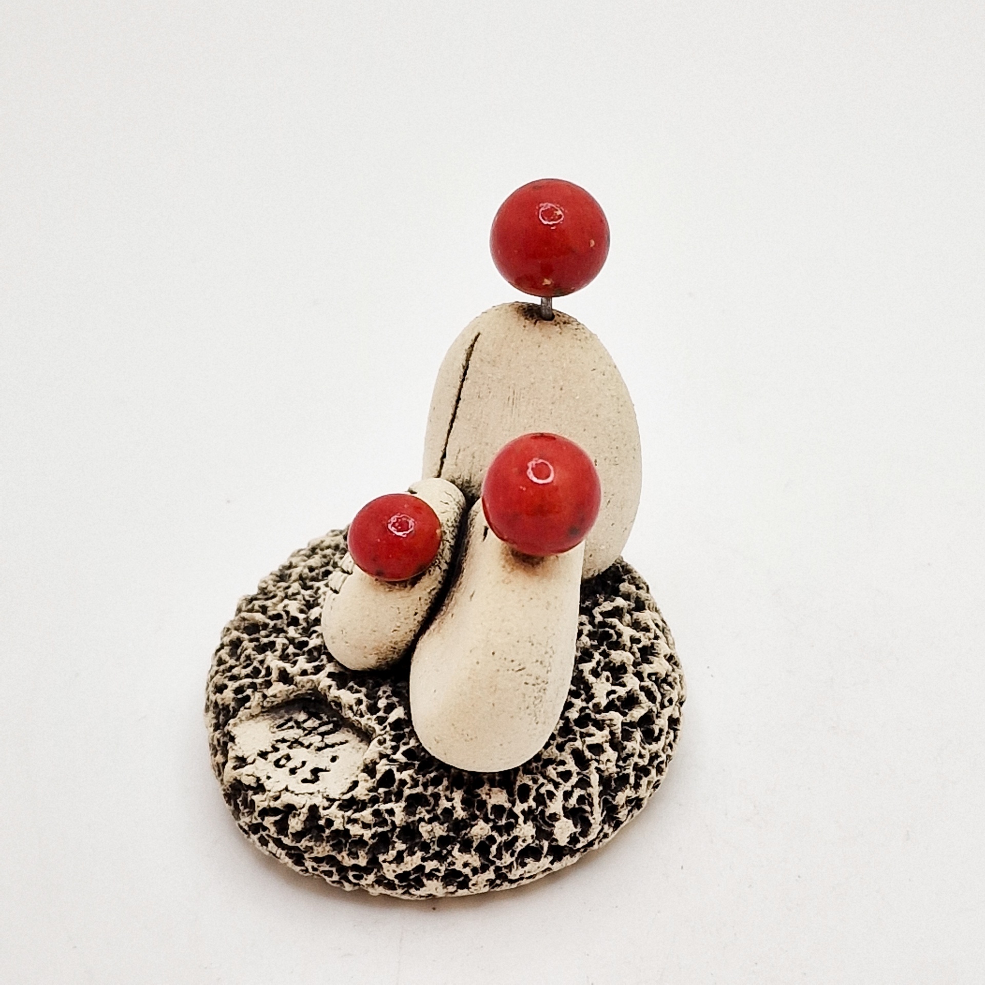 • Escultura pequena com pedras e bolas vermelhas sobre base texturizada