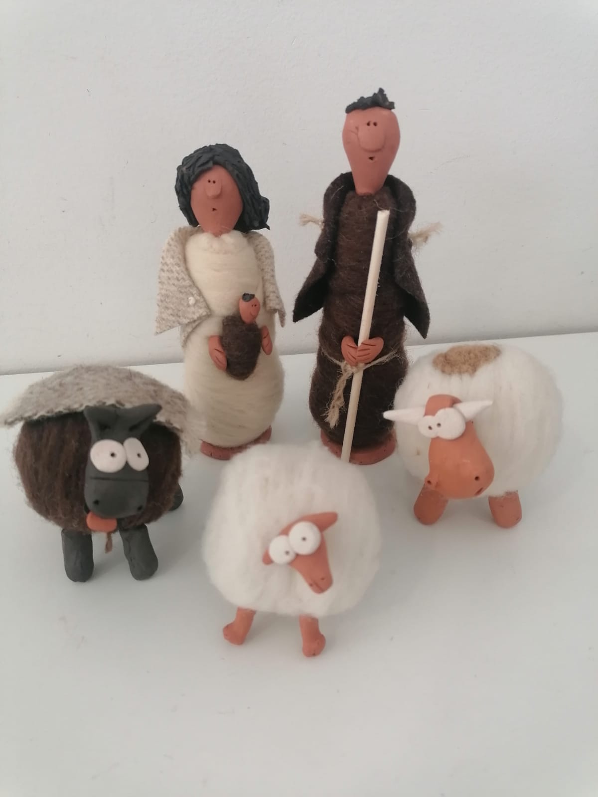 • Conjunto de figuras decorativas de lã e barro com personagens e animais