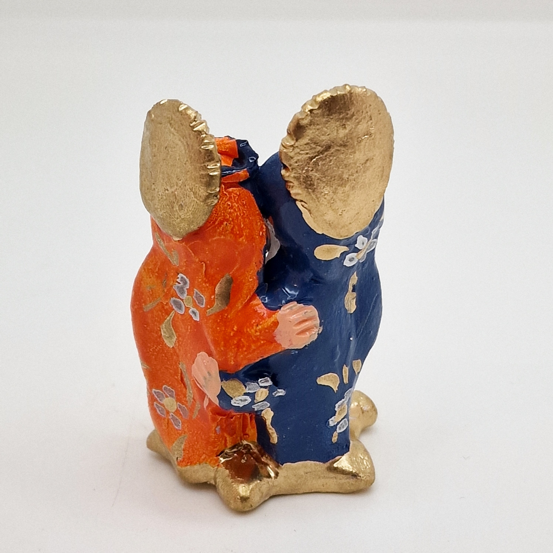 • Figurinha cerâmica de dois ratos coloridos com detalhes dourados