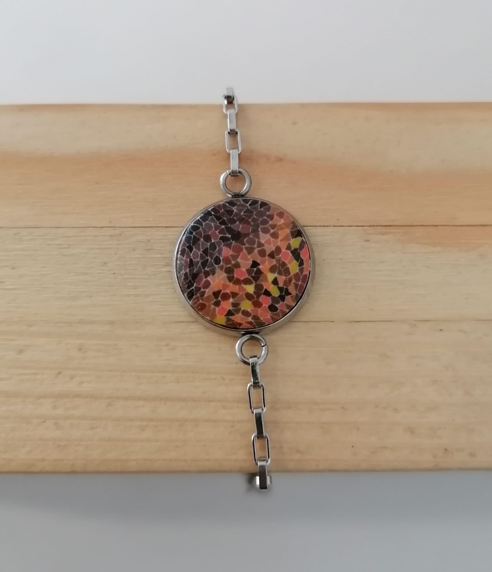 Pulseira Gaudí 12,00 € Desconto de %. IVA incluído. Partilhar Comprar Contactar Características Cores da argila: Multicor com várias tonalidades das cores laranja e castanho Metal: Aço Inoxidável - Antialérgico Peso: 3,5 gr Comprimento da pulseira: 18cm Diâmetro da medalha: 15mm As cores dos produtos poderão sofrer ligeiras alterações devido à reprodução fotográfica. Tags pulseiraaçoinoxmulticorgaudícastanholaranjamade in portugualatelier Características