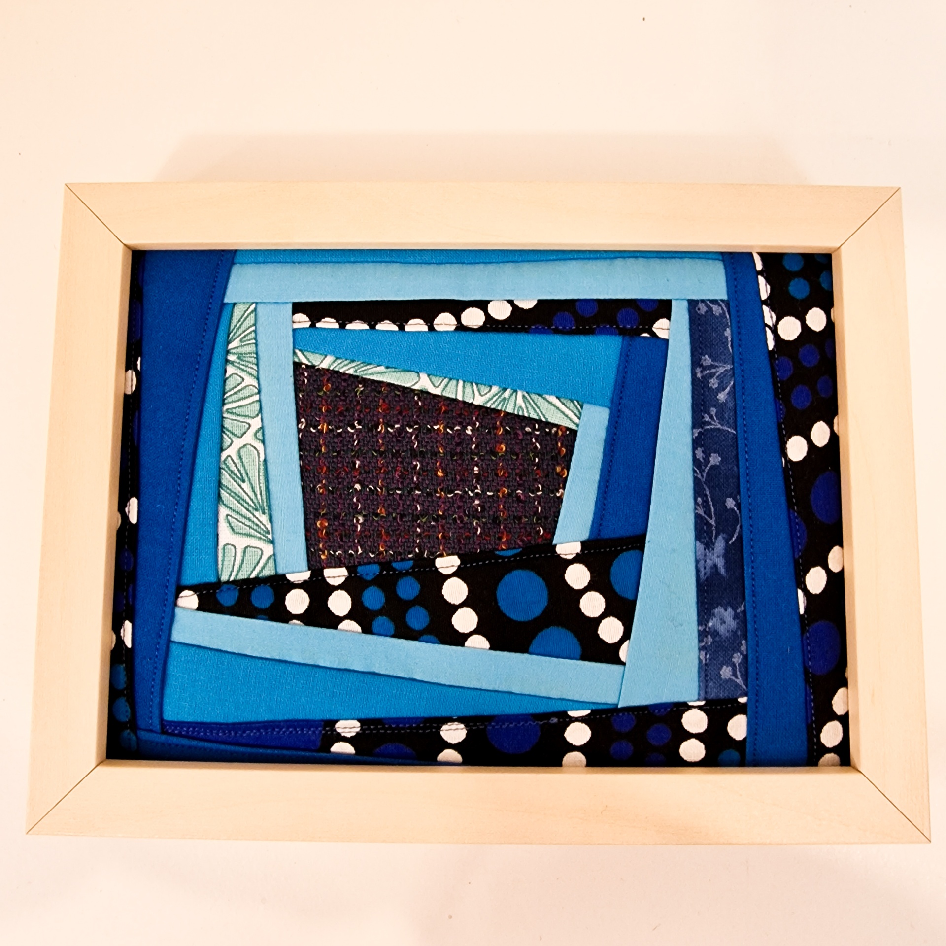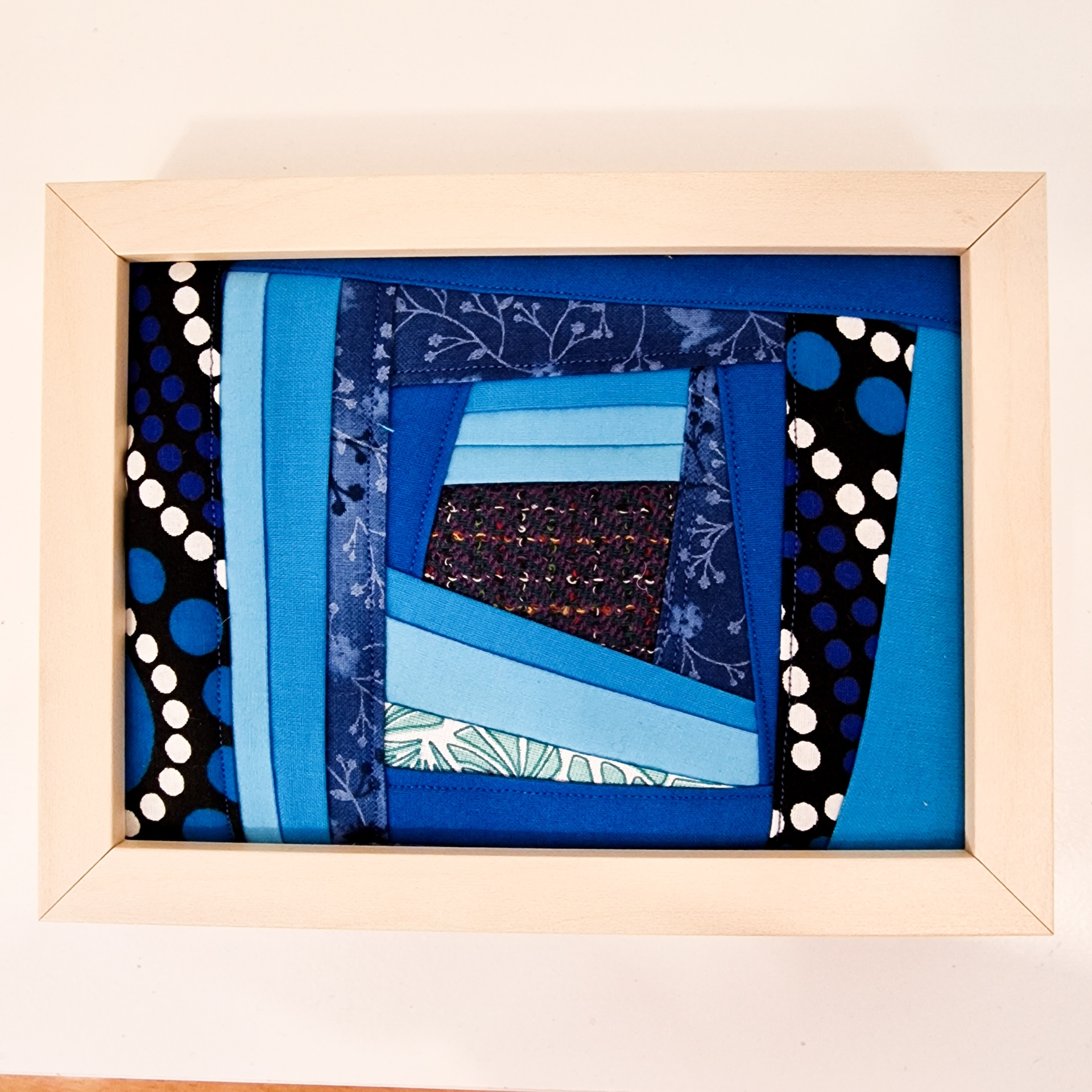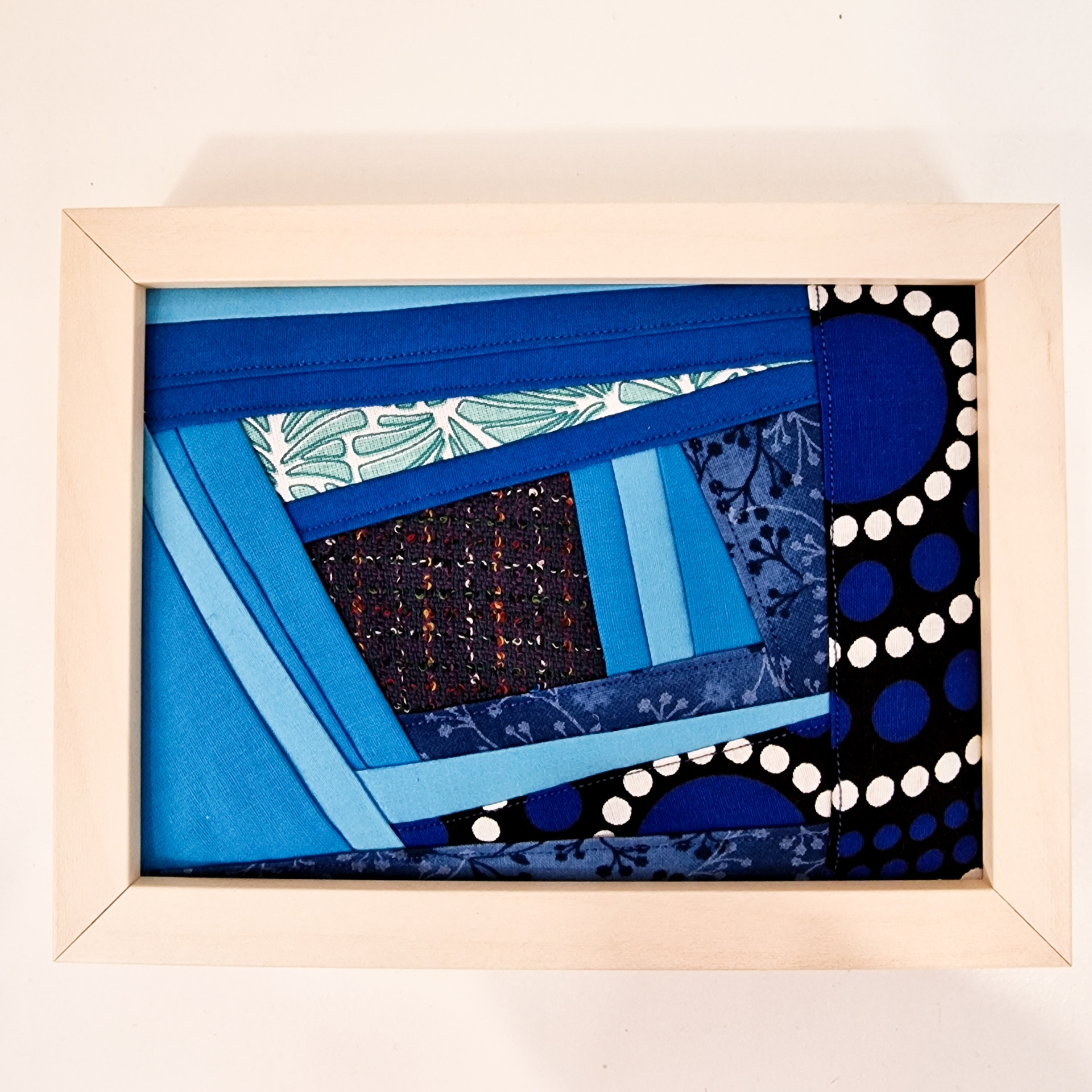 • Quadro patchwork em tons de azul e preto com pontos brancos, moldura de madeira clara