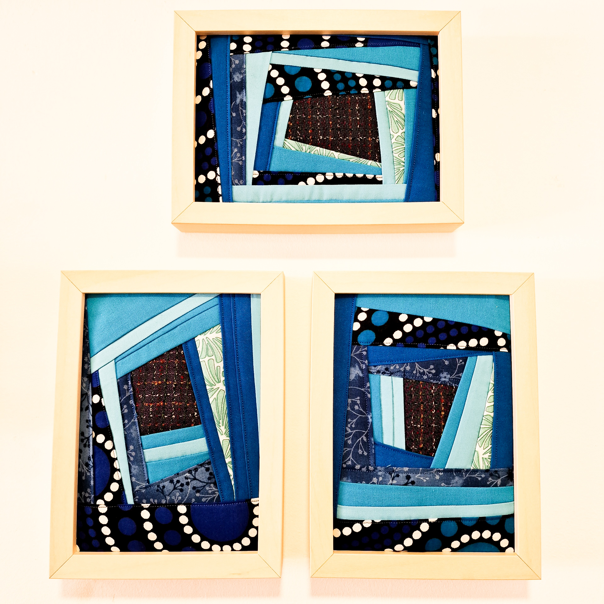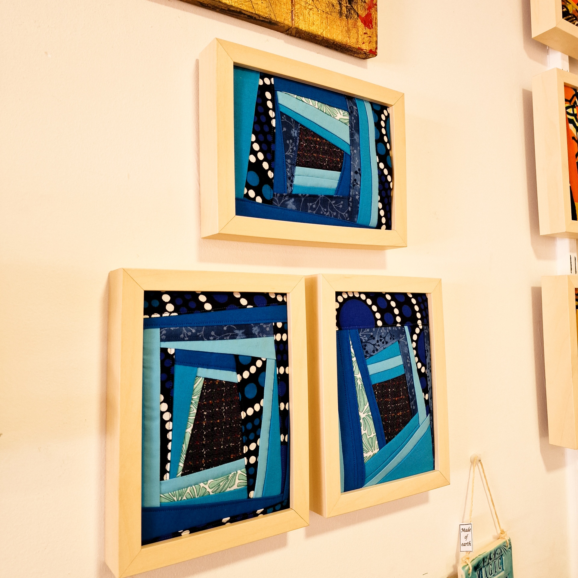 Três quadros com trabalhos têxteis em azul e preto com molduras de madeira clara
