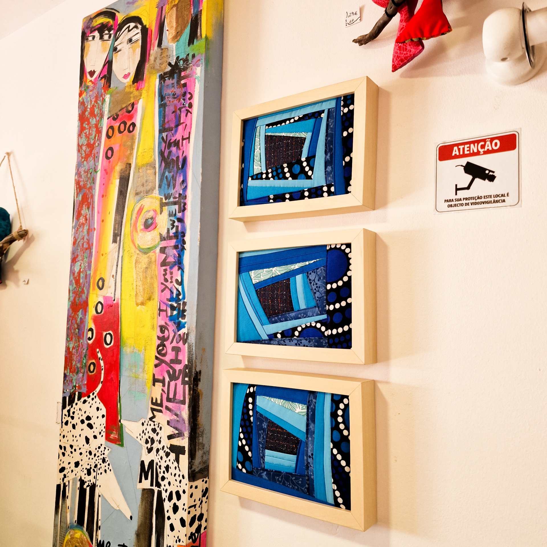 • Parede com quatro quadros artísticos e placa de aviso de segurança