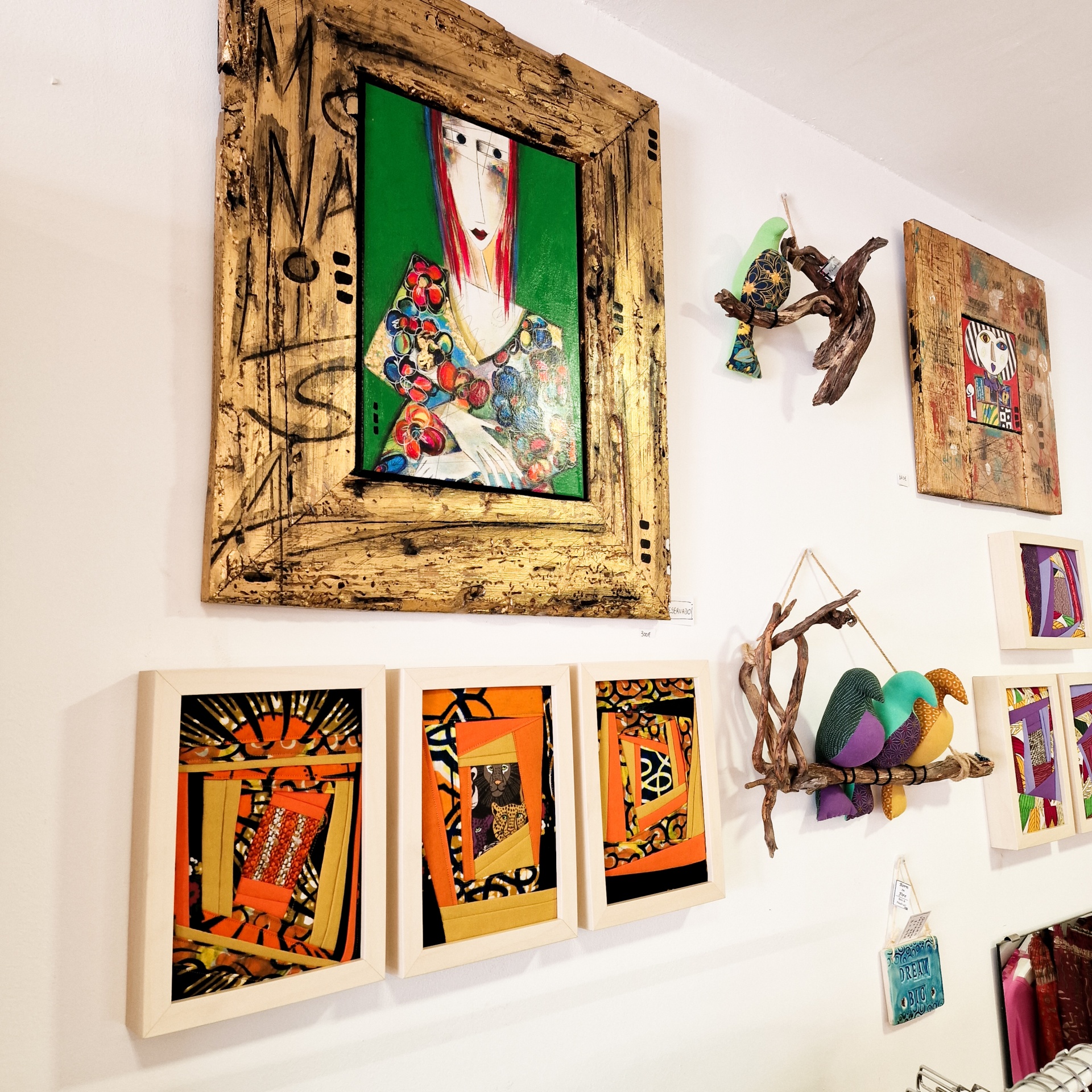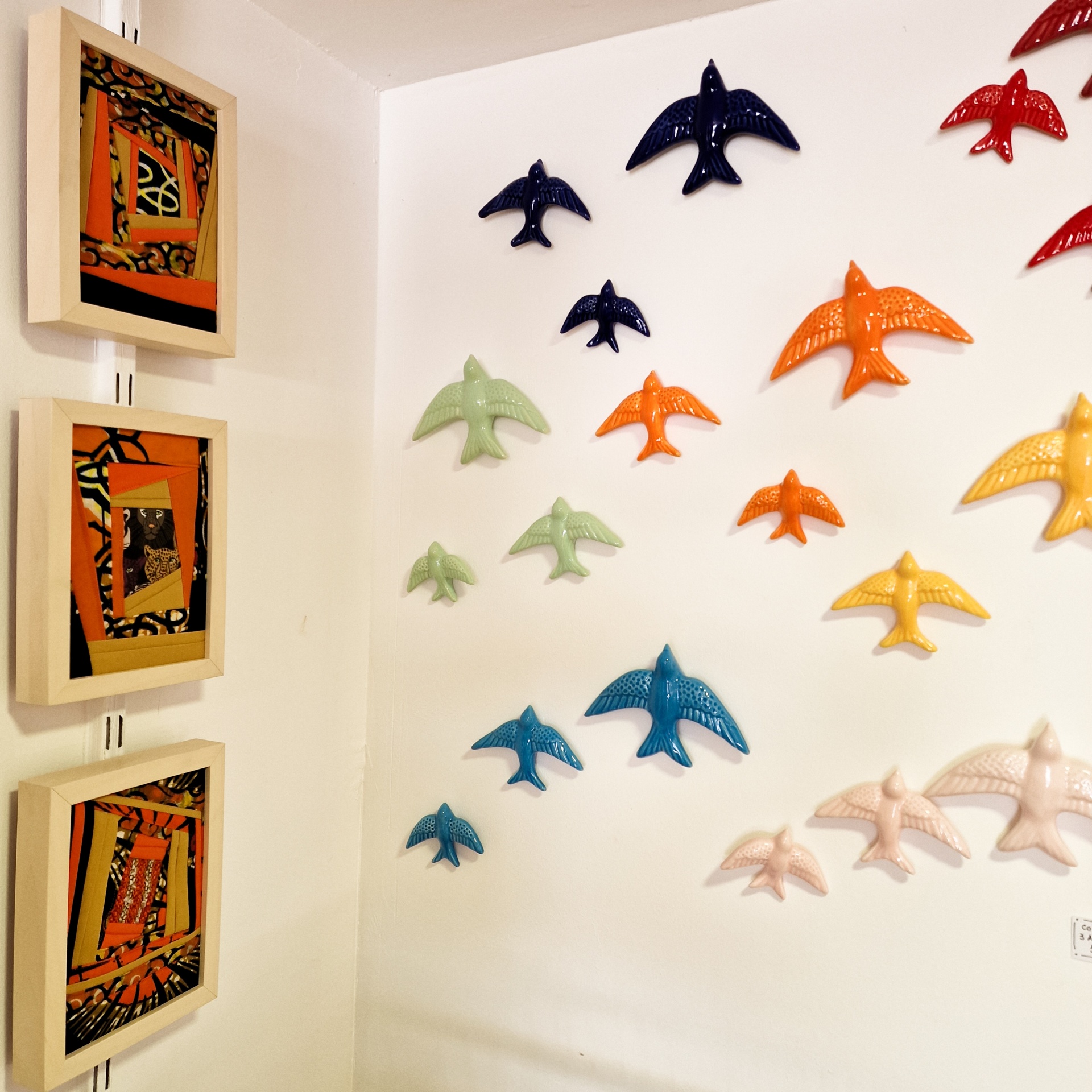 • Parede branca com aves de cerâmica coloridas e três quadros artísticos em moldura bege