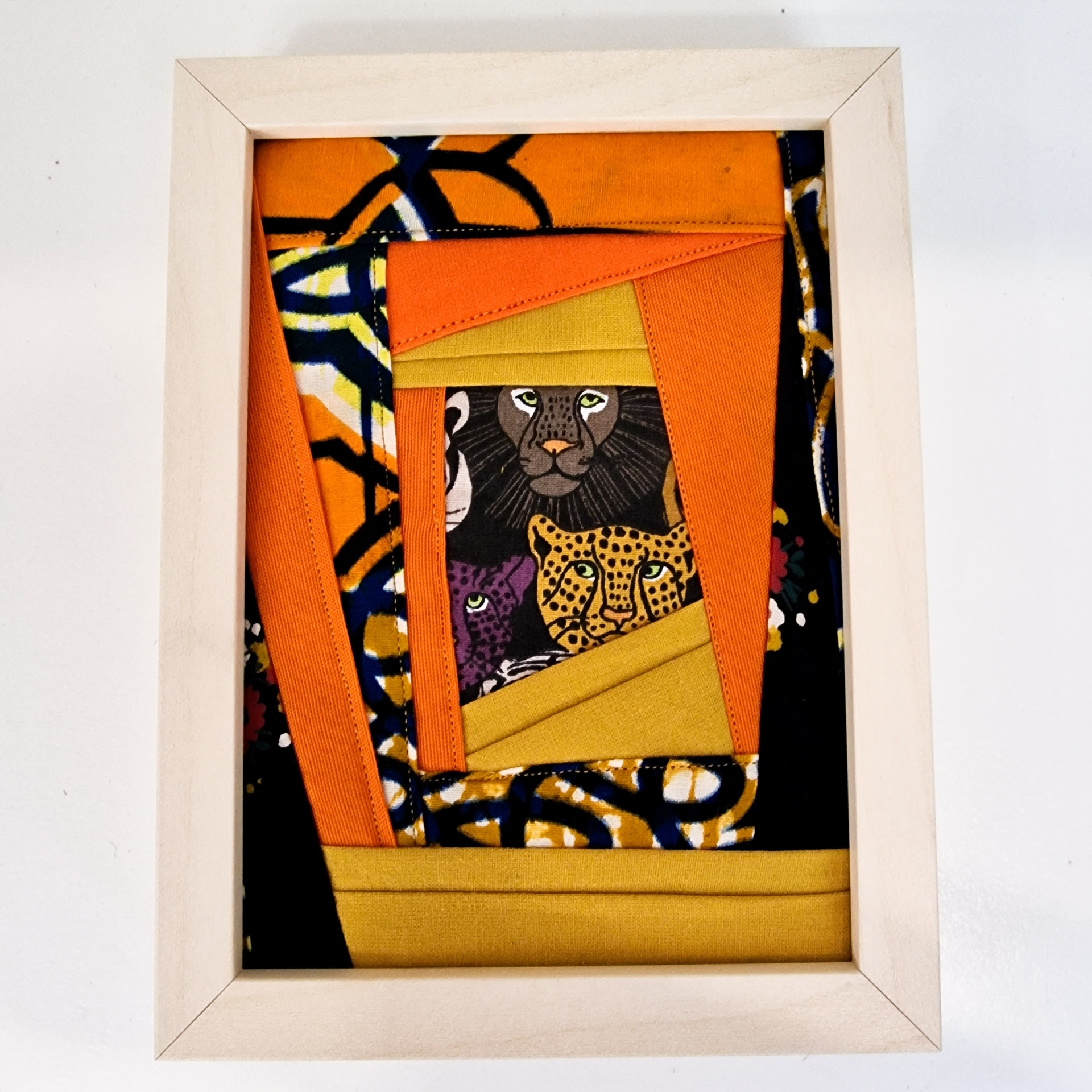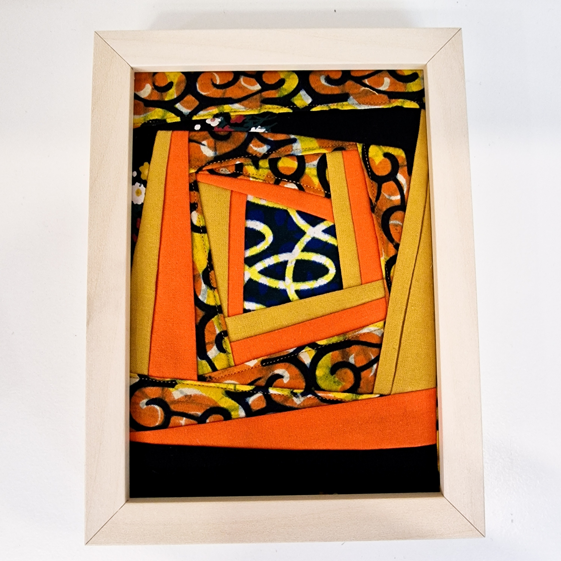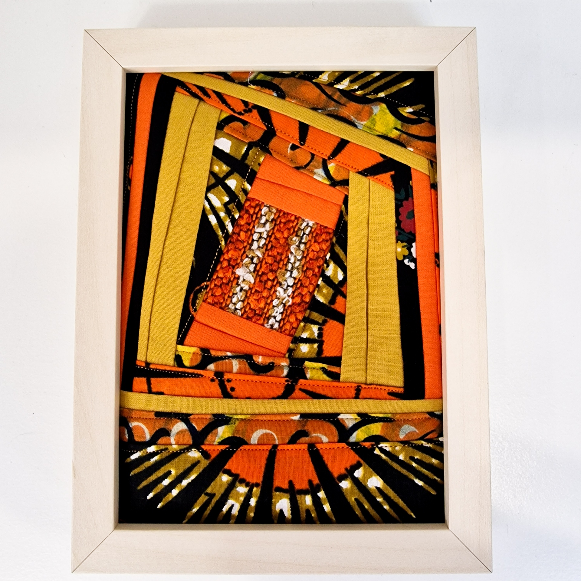 • Quadro branco com tecido colorido padrão geométrico em tons de laranja, preto e amarelo
