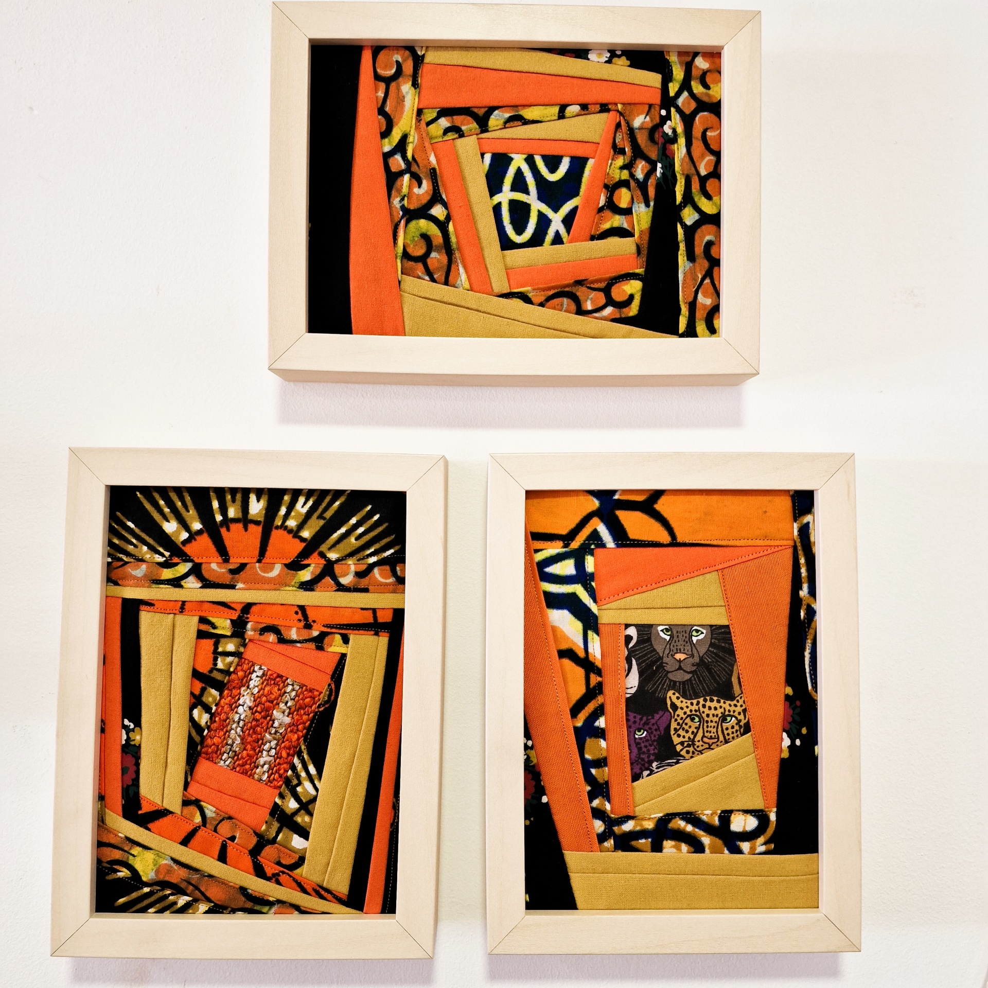 • Três quadros com moldura branca e tecidos coloridos laranja e preto com padrões geométricos