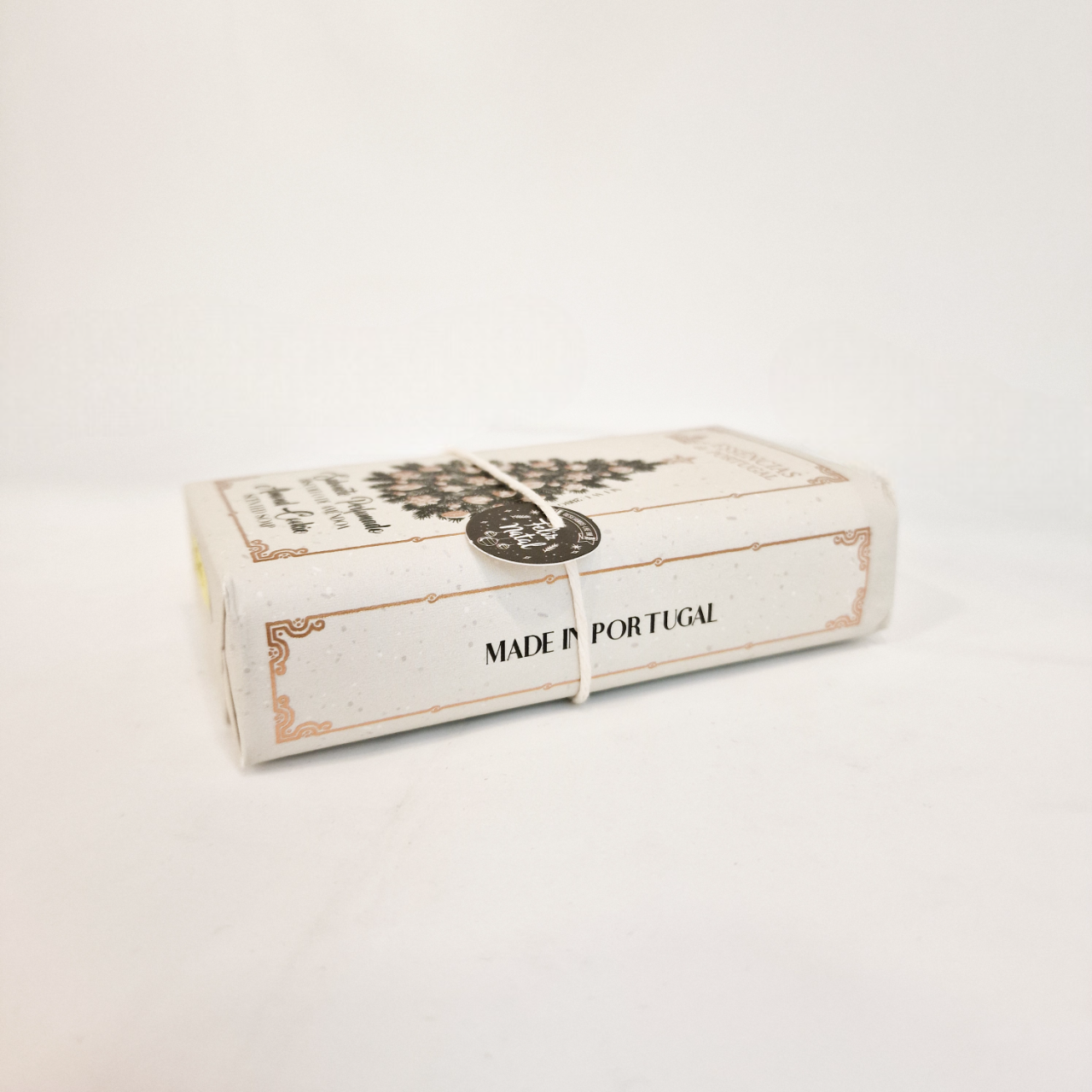 • Sabonete em caixa branca com detalhes dourados e texto 'MADE IN PORTUGAL', amarrado com cordão branco