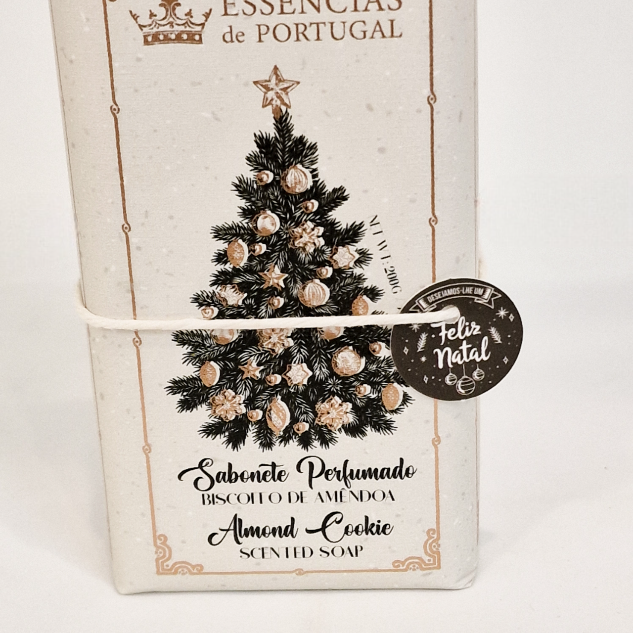 • Sabonete perfumado embalado com ilustração de árvore de Natal e selo de 'Feliz Natal'