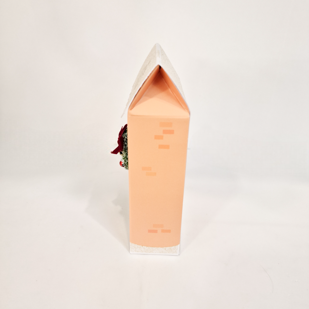 • Caixa decorativa em forma de casa com parede cor de pêssego e detalhes de tijolos e telhado branco