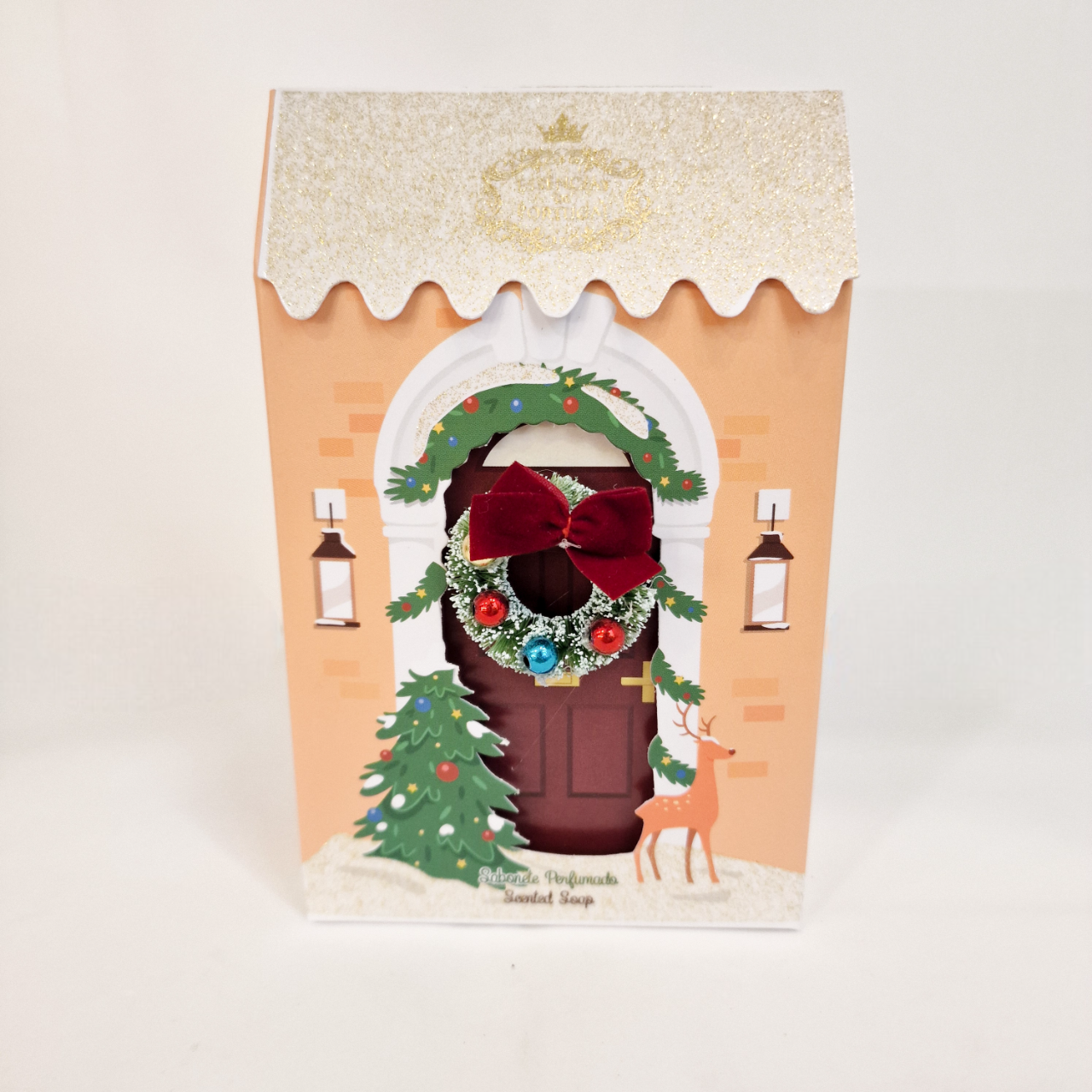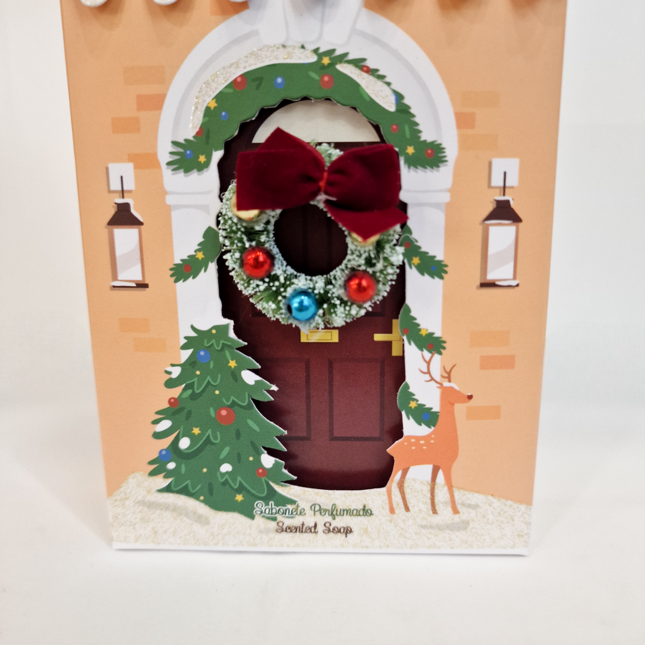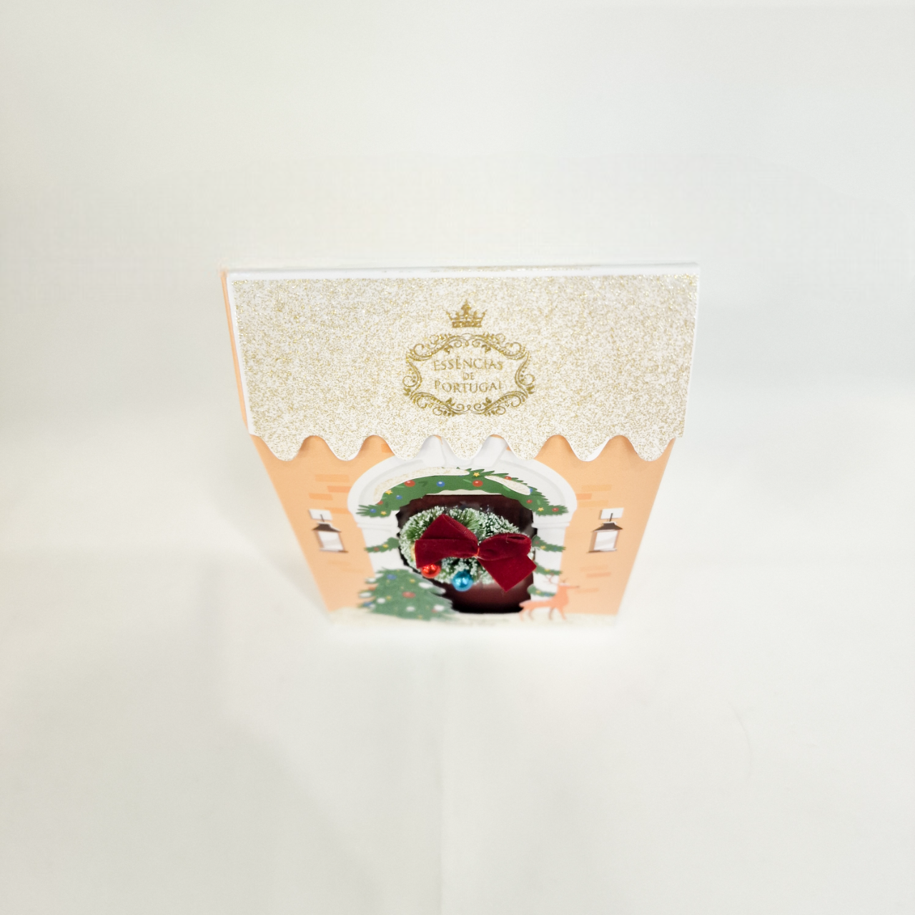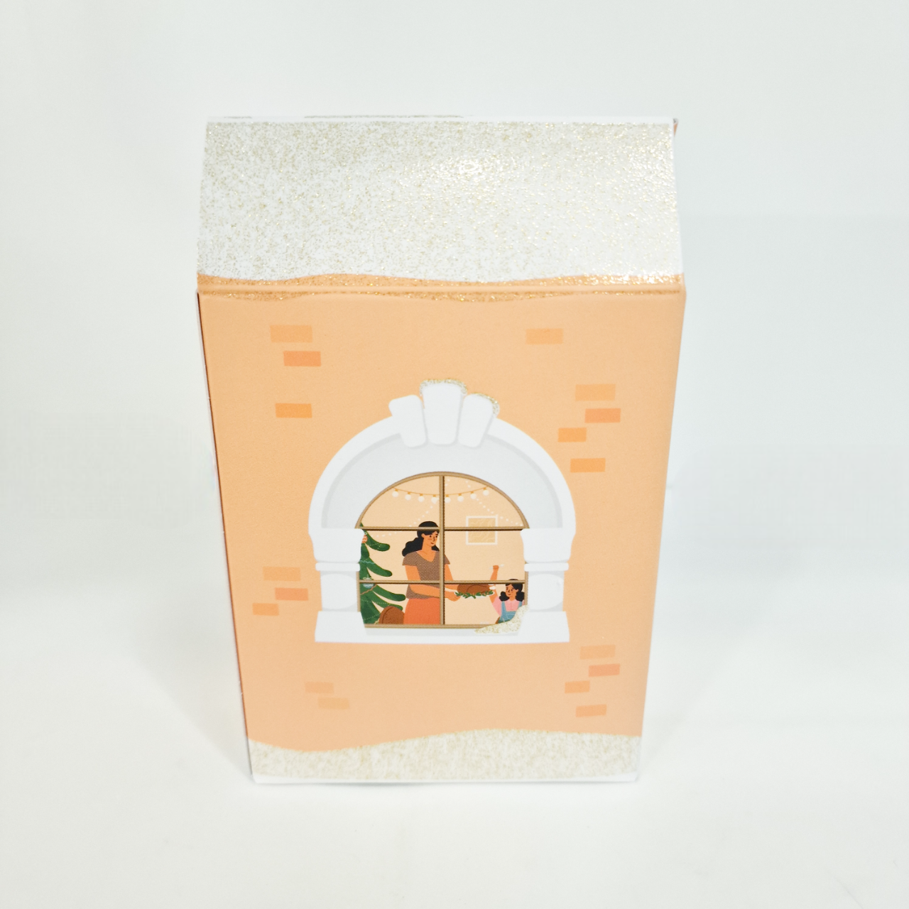 • Caixa decorativa em formato de casa com motivos natalícios e detalhes brilhantes