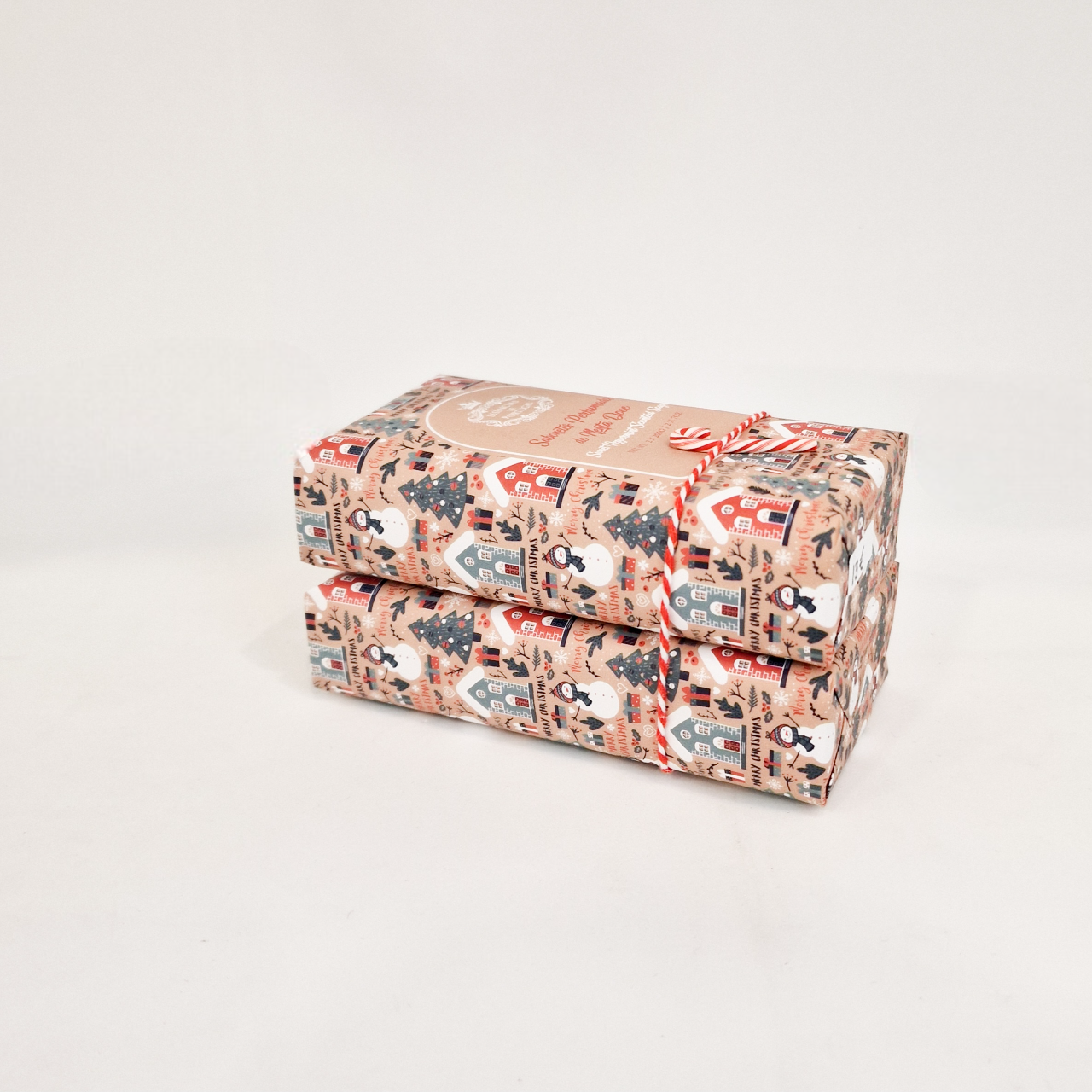 • Embalagem de sabonete perfumado com tema de Natal e design de casinhas coloridas.
