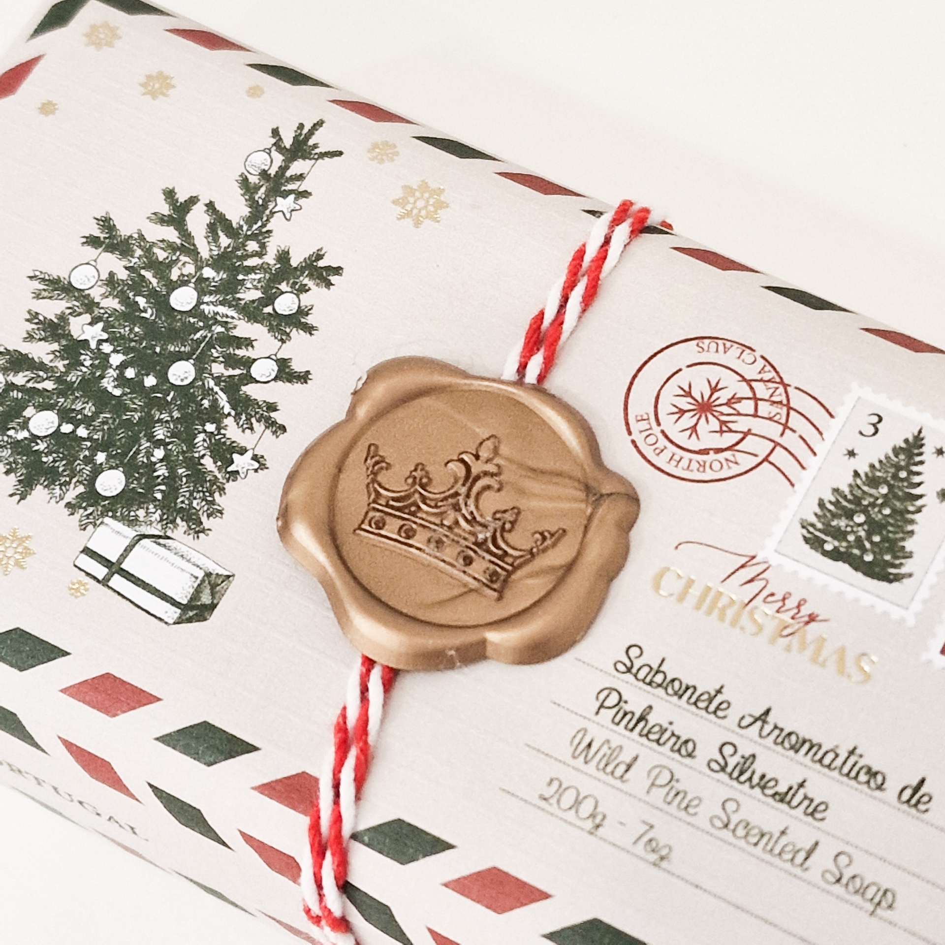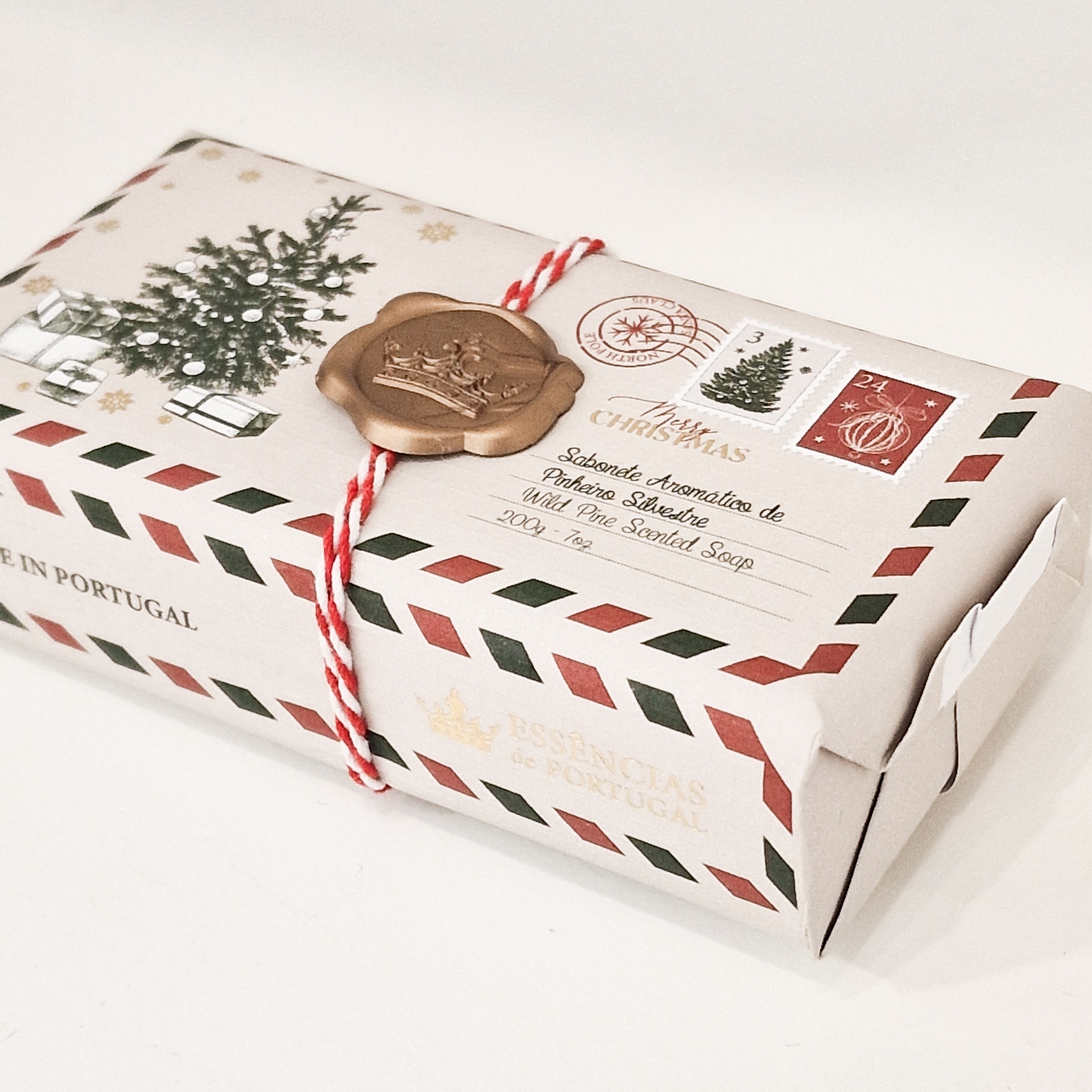 • Sabonete aromático com embalagem de Natal decorada com árvore, presentes e selo dourado.