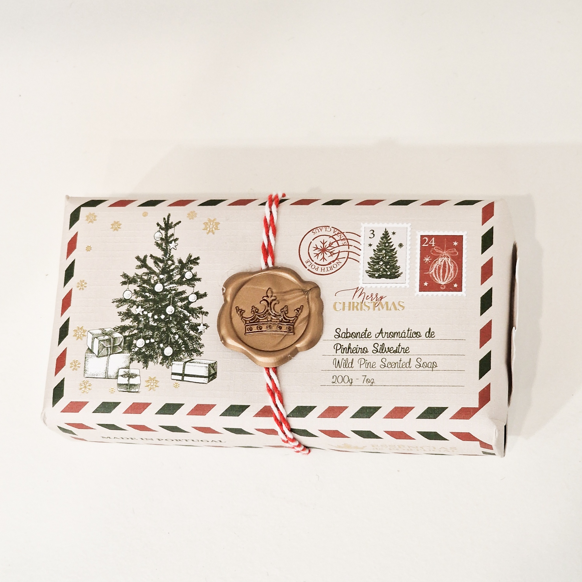 • Sabonete aromático de pinheiro silvestre em embalagem natalícia com selo e cordão