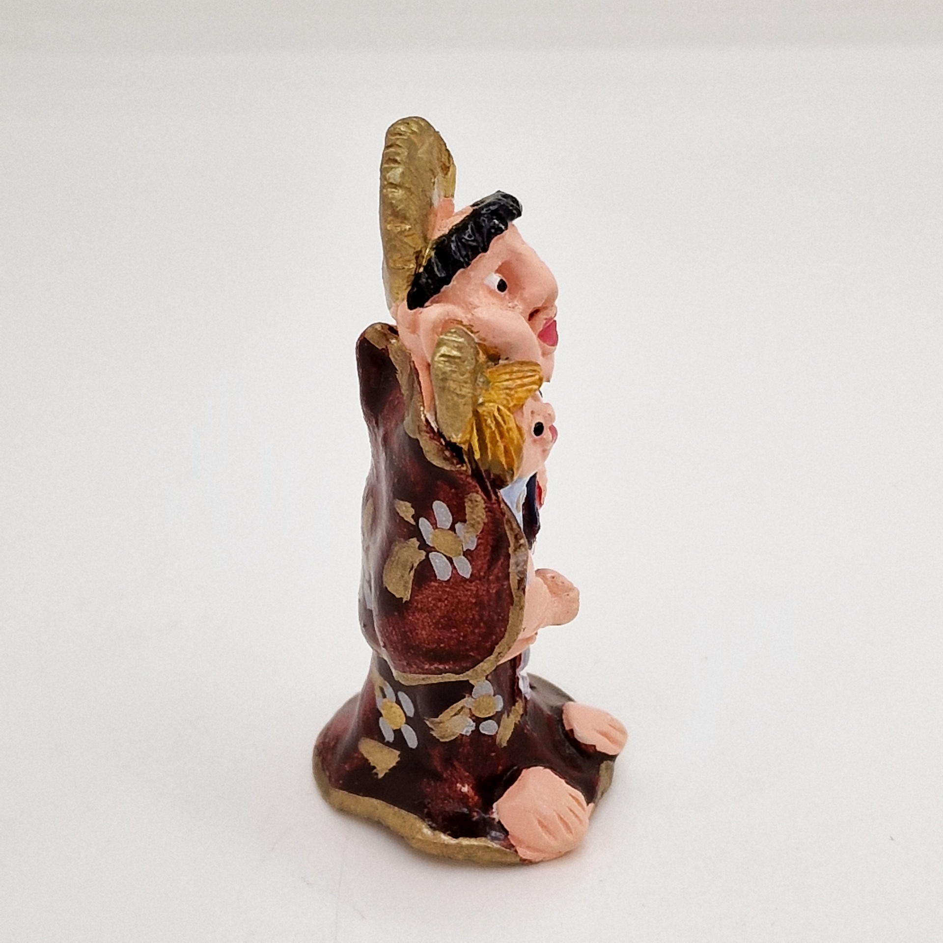 • Estatueta de cerâmica de figura humana ajoelhada com roupa castanha e flores