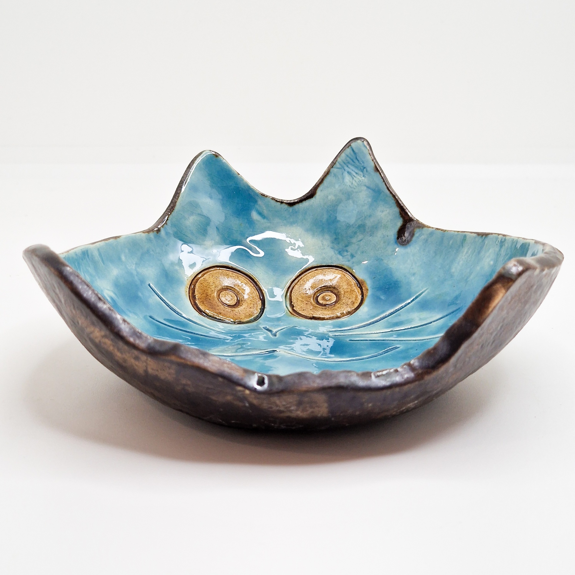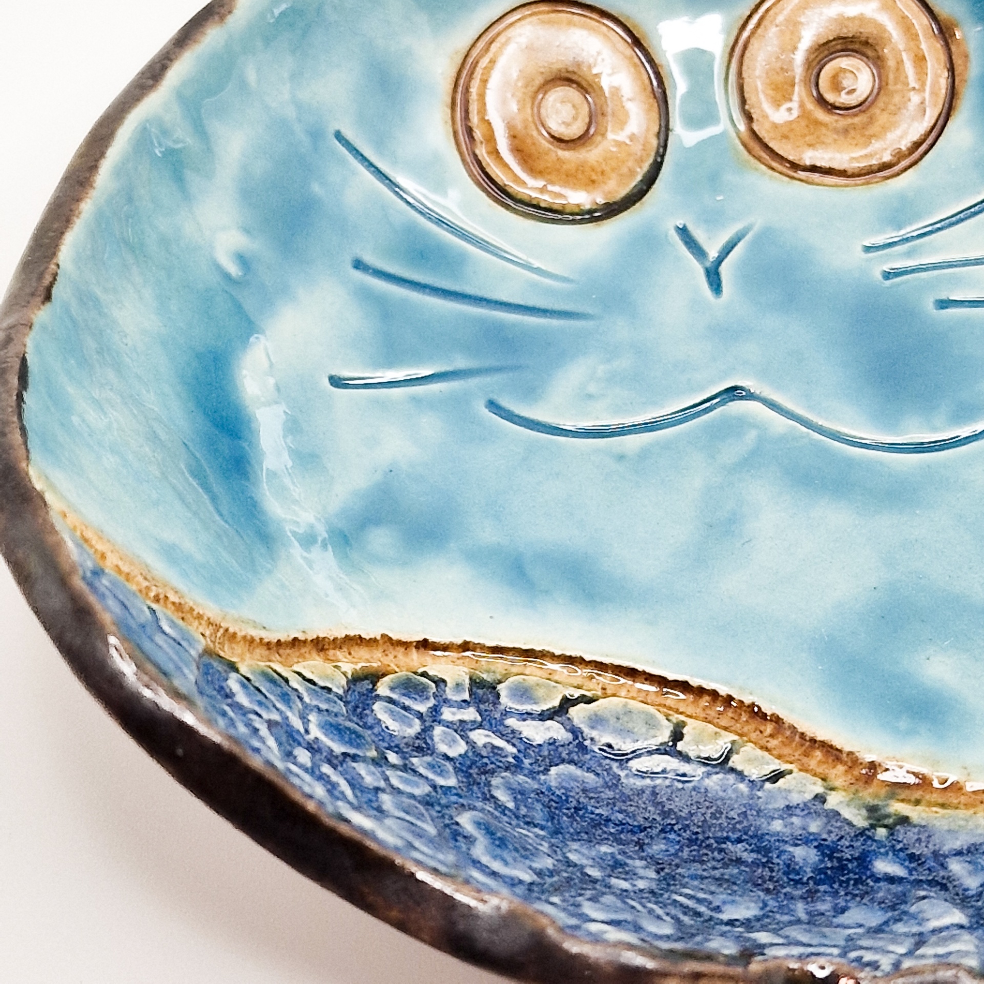• Prato cerâmico azul em forma de cabeça de gato com olhos dourados e detalhes texturizados