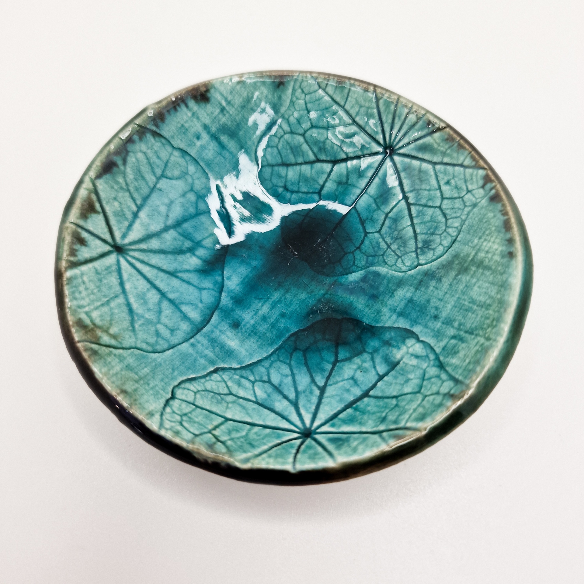 • Prato cerâmico redondo com padrão de folhas azuis e verdes