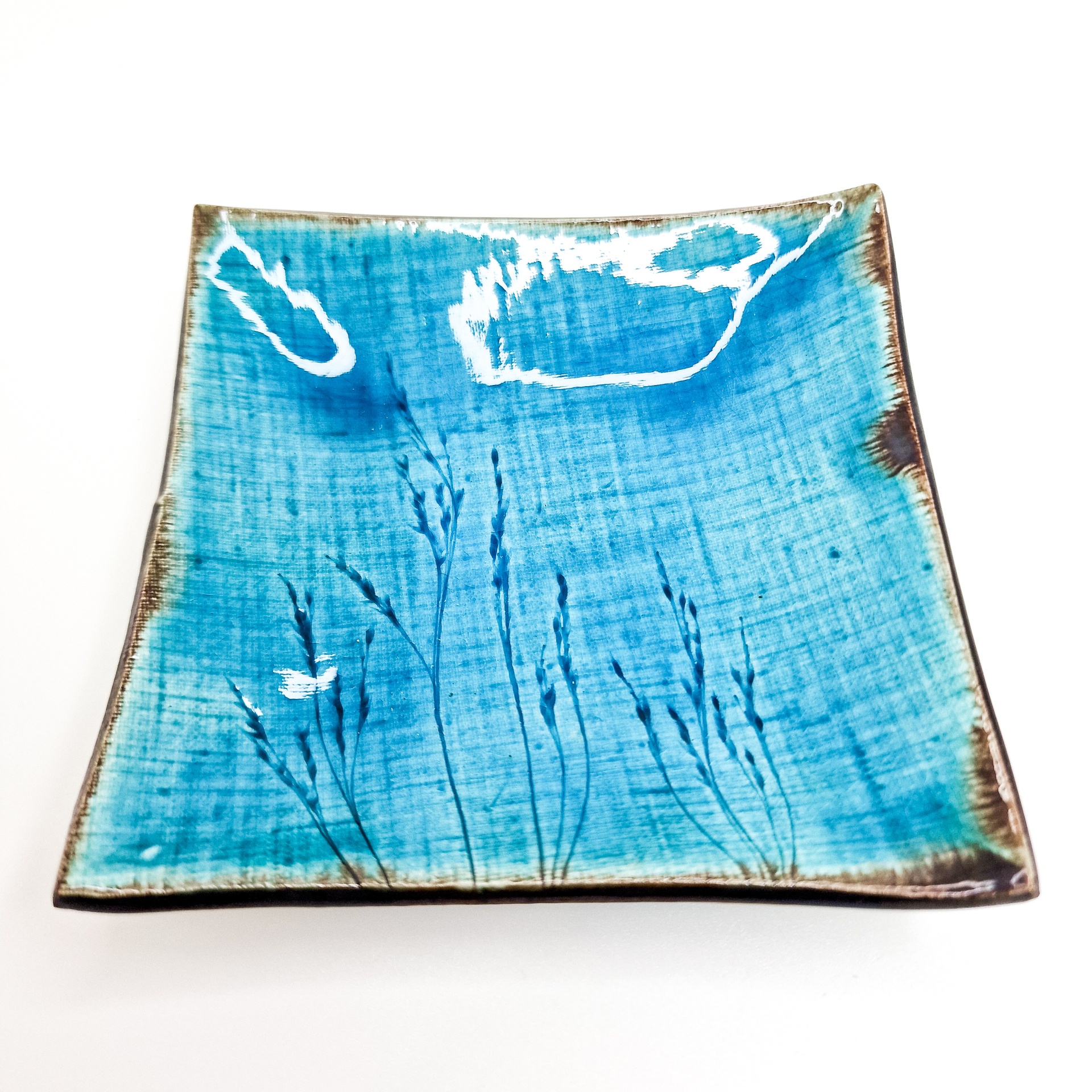 • Prato quadrado azul de cerâmica com padrão de plantas e bordas castanhas