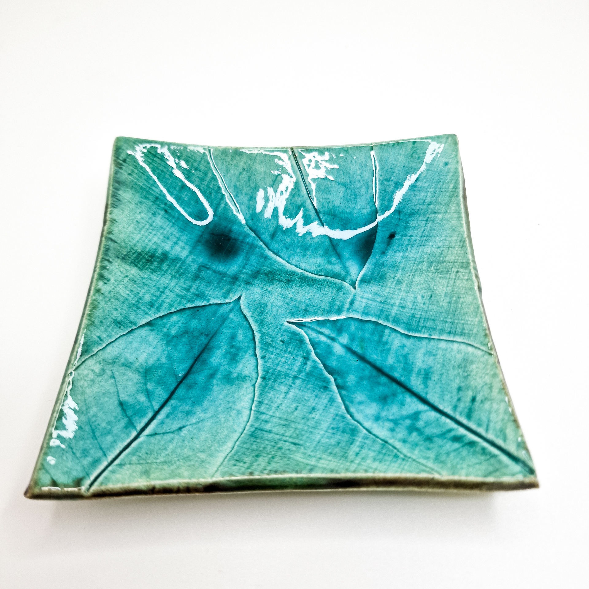 • Prato quadrado de cerâmica azul turquesa com textura de folhas
